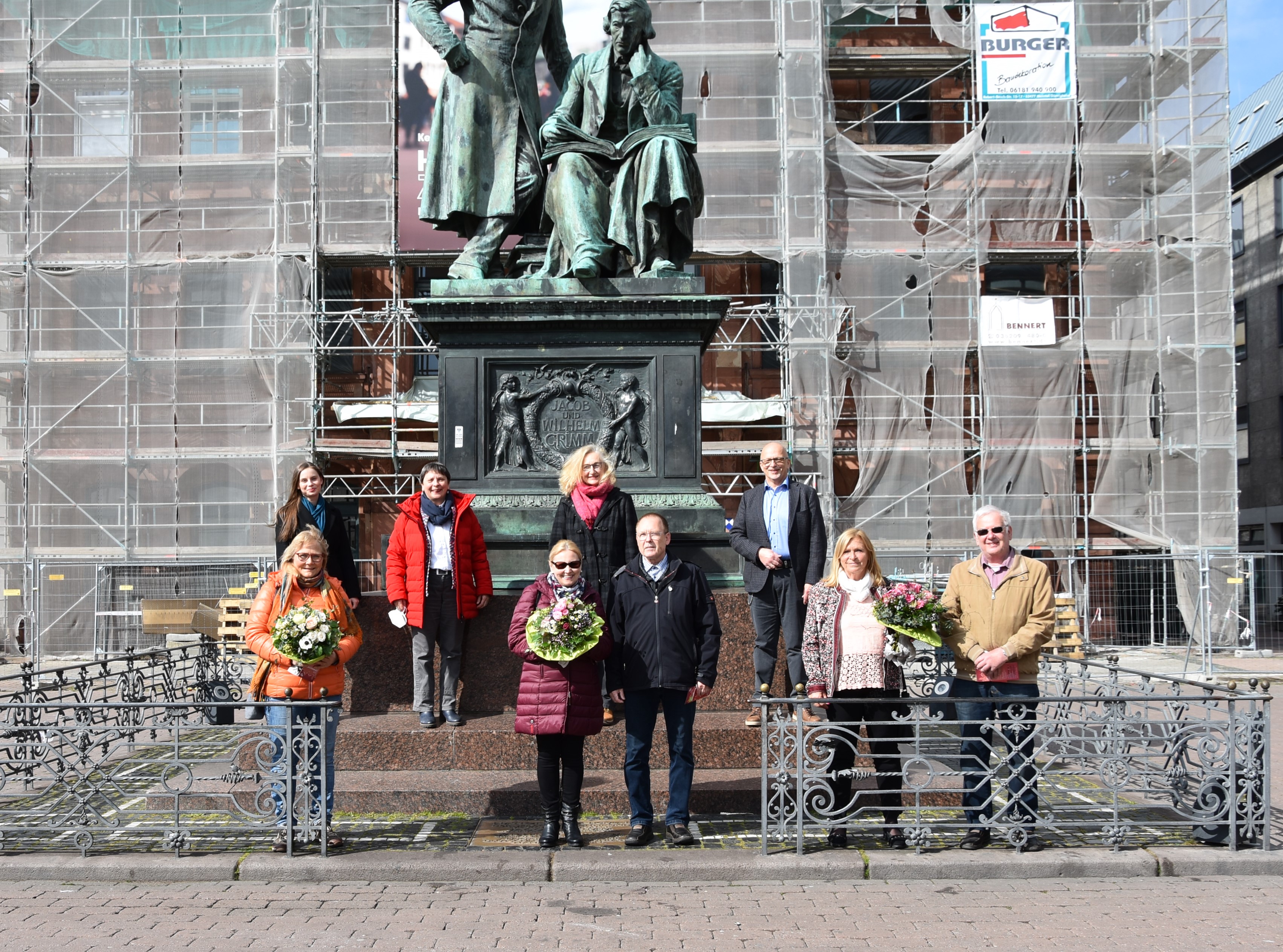 Um den Dank der Stadt für ihren wichtigen Einsatz als Pflegeeltern zum Ausdruck zu bringen, übergab Bürgermeister Axel Weiss-Thiel vor dem Brüder Grimm-Denkmal einen Blumengruß und Grimmschecks an Petra Thon, Margit und Hans-Joachim Halin sowie an Renate und Reiner Wegener. (Auf die Masken wurde nur für den kurzen Augenblick der Aufnahme verzichtet.)