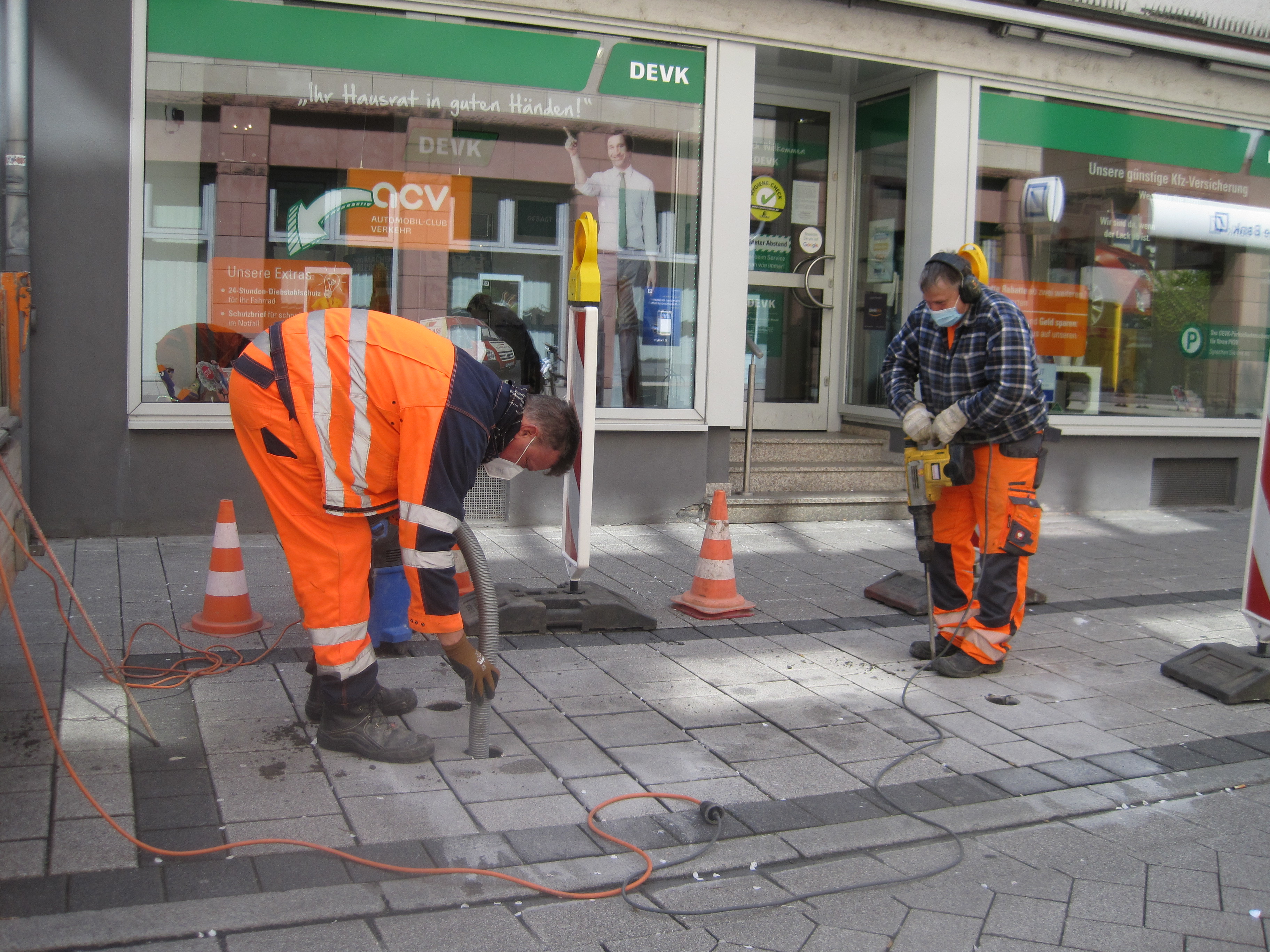 Bauhof-Mitarbeiter Olaf Westphal (rechts) bohrt Löcher für eine Sitzbank, sein Kollege Holger Fischer säubert mit einem Staubsauger die Bohrlöcher.