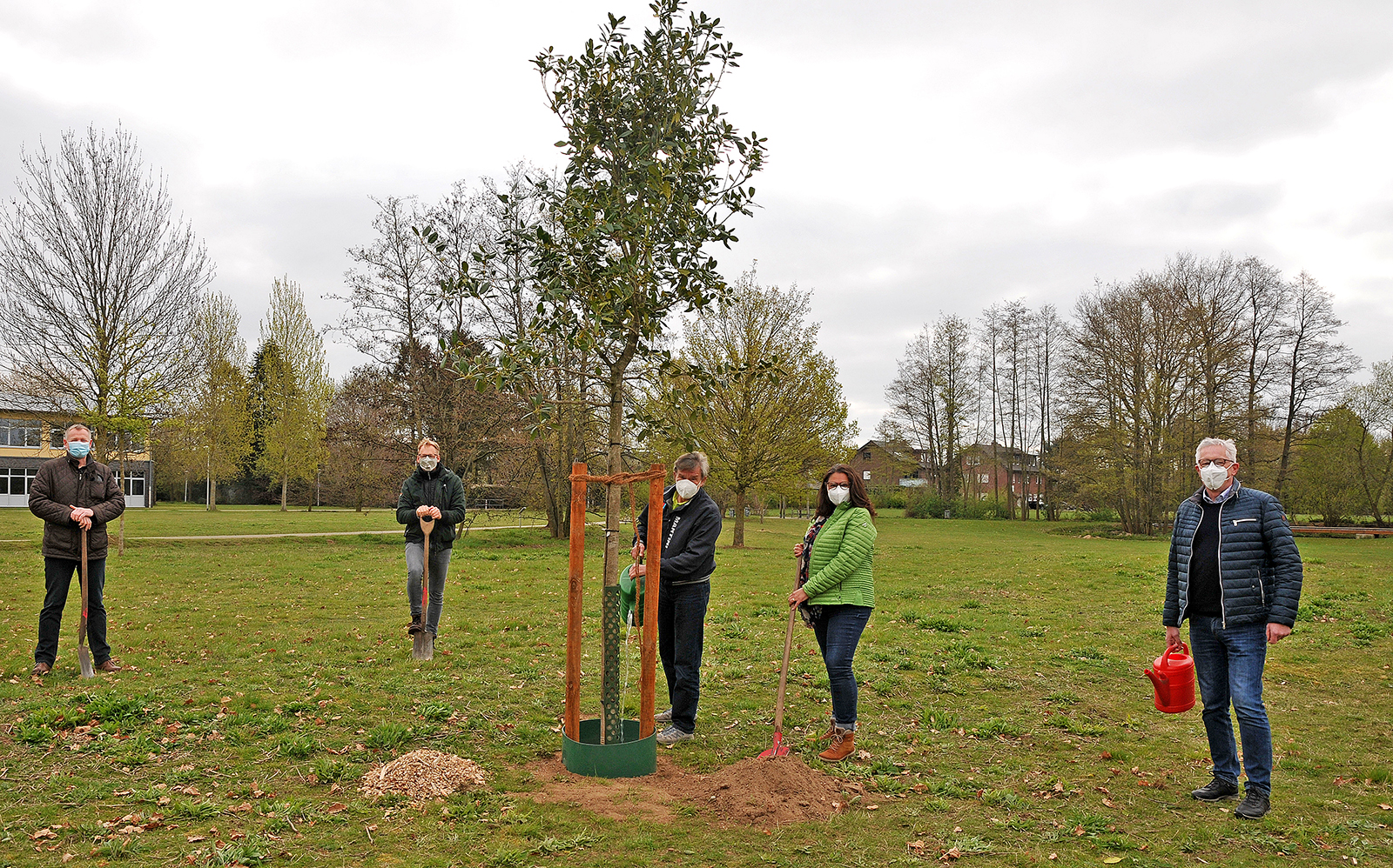 Bernhard Lübberdink, Stadtbaurat Daniel Zöhler, die Baumpaten Detlef und Petra Schultz sowie Michael Wiesmann (v.l.n.r.) mit dem Baum des Jahres, der Stechpalme (Ilex Aquifolium) - Foto. Bruno Wansing, Stadt Bocholt