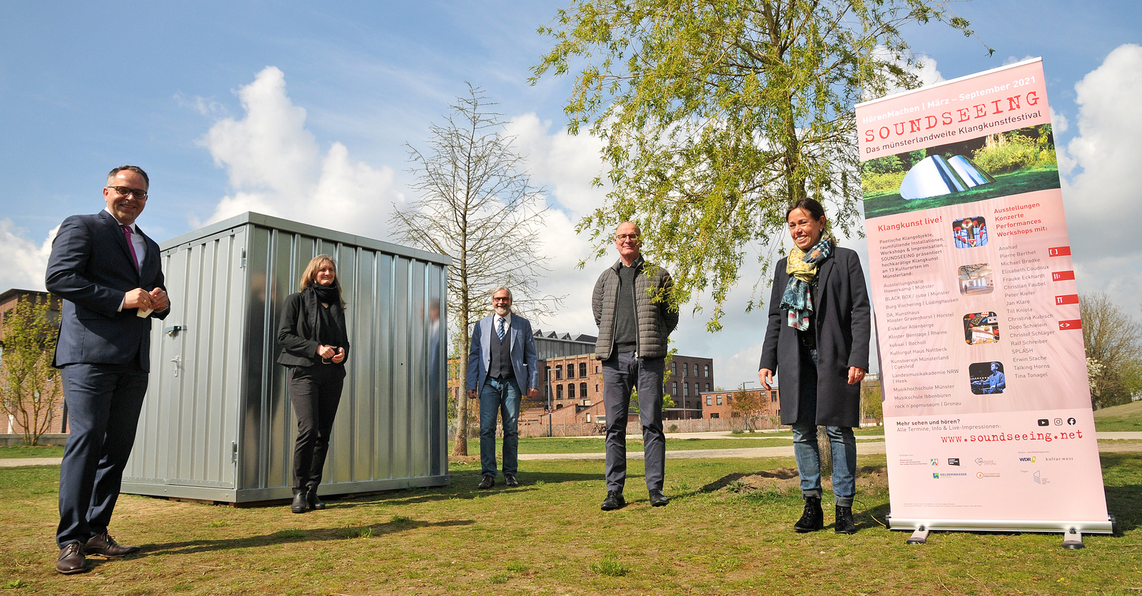 Die Ausstellung "Globl drifting", bei der drei klangvolle Container im Mittelpunkt stehen, eröffneten (von links nach rechts) Bürgermeister Thomas Kerkhoff, die Künstlerin Frauke Eckhardt, Martin Schmidt vom Textilwerk, Kurator Stephan Froleyks von der Musikhochschule Münster und Jule Wanders vom Fachbereich Kultur und Bildung der Stadt Bocholt - Foto: Bruno Wansing, Stadt Bocholt.