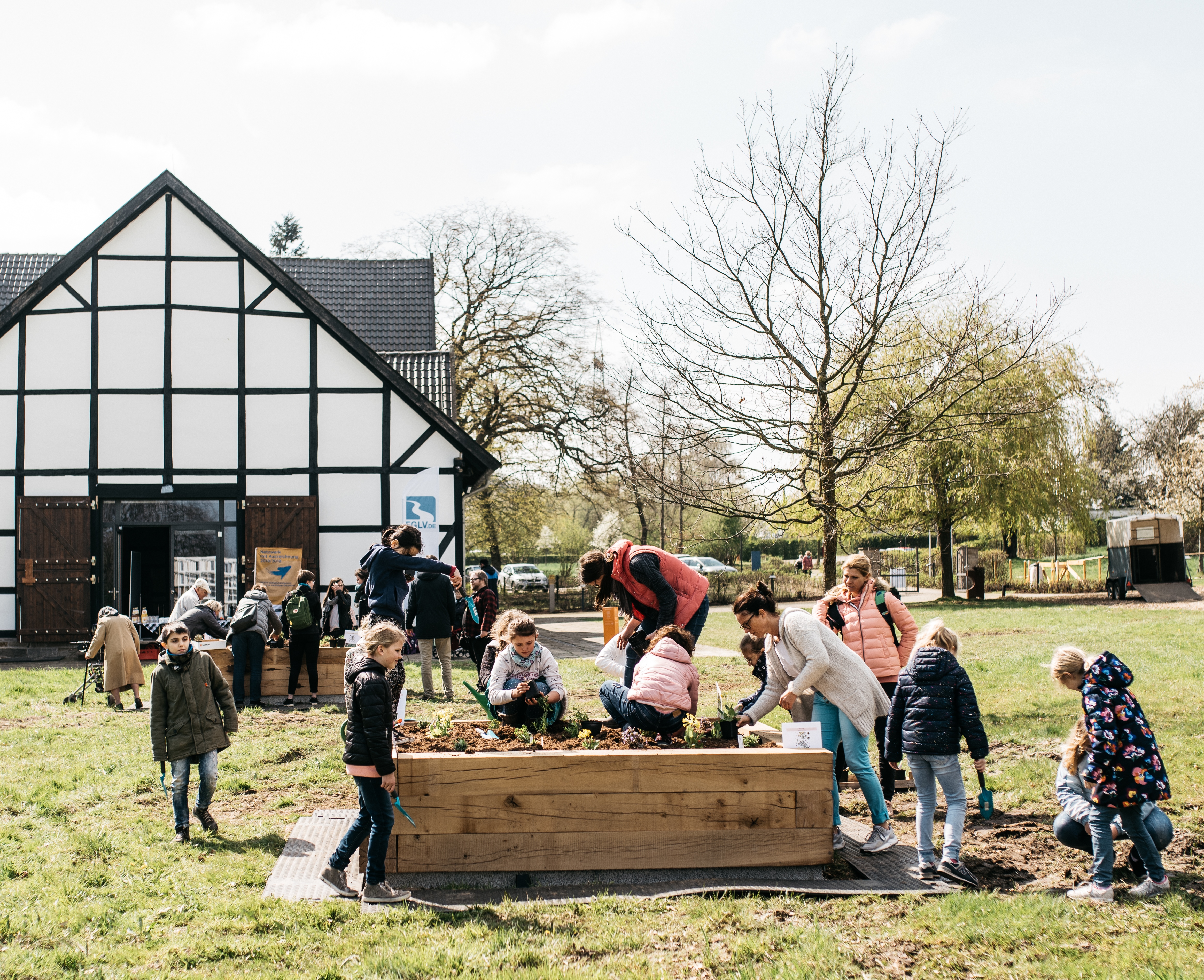 SchülerInnen bepflanzen das Hochbeet (HINWEIS: Dieses Bild ist in der Zeit vor Corona entstanden)