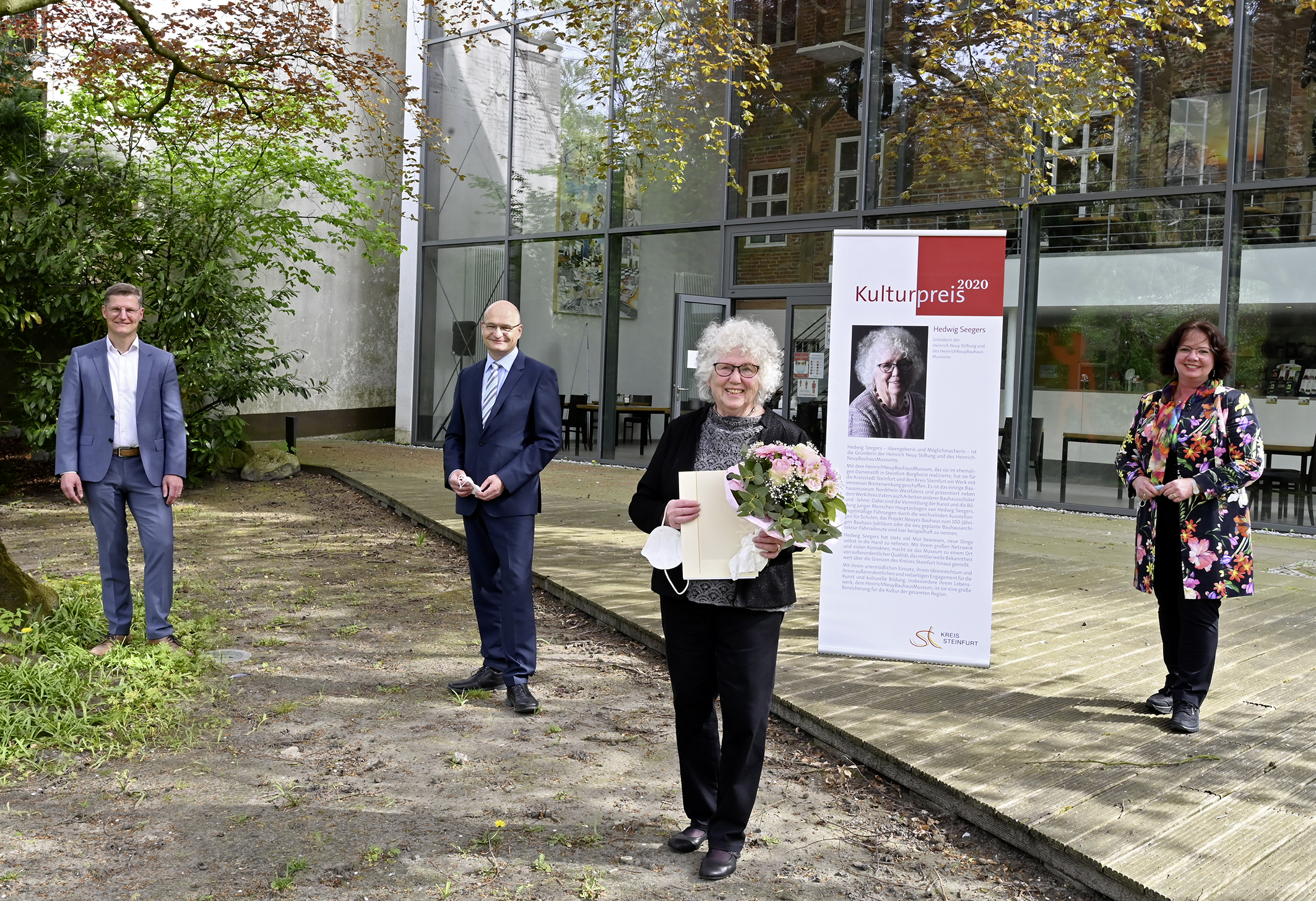 Coronabedingt war die Übergabe des Kreis-Kulturpreises 2020 verschoben worden. Somit konnte Preisträgerin Hedwig Seegers die Auszeichnung nun im Jubiläumsjahr des HeinrichNeuyBauhausMuseums von Landrat Dr. Martin Sommer entgegennehmen. Sie hatte das Museum im Jahr 2011 gegründet. Zum Preis gratulierten persönlich auch Kreis-Kulturdezernent Tilman Fuchs und Steinfurts Bürgermeiterin Claudia Bögel-Hoyer.