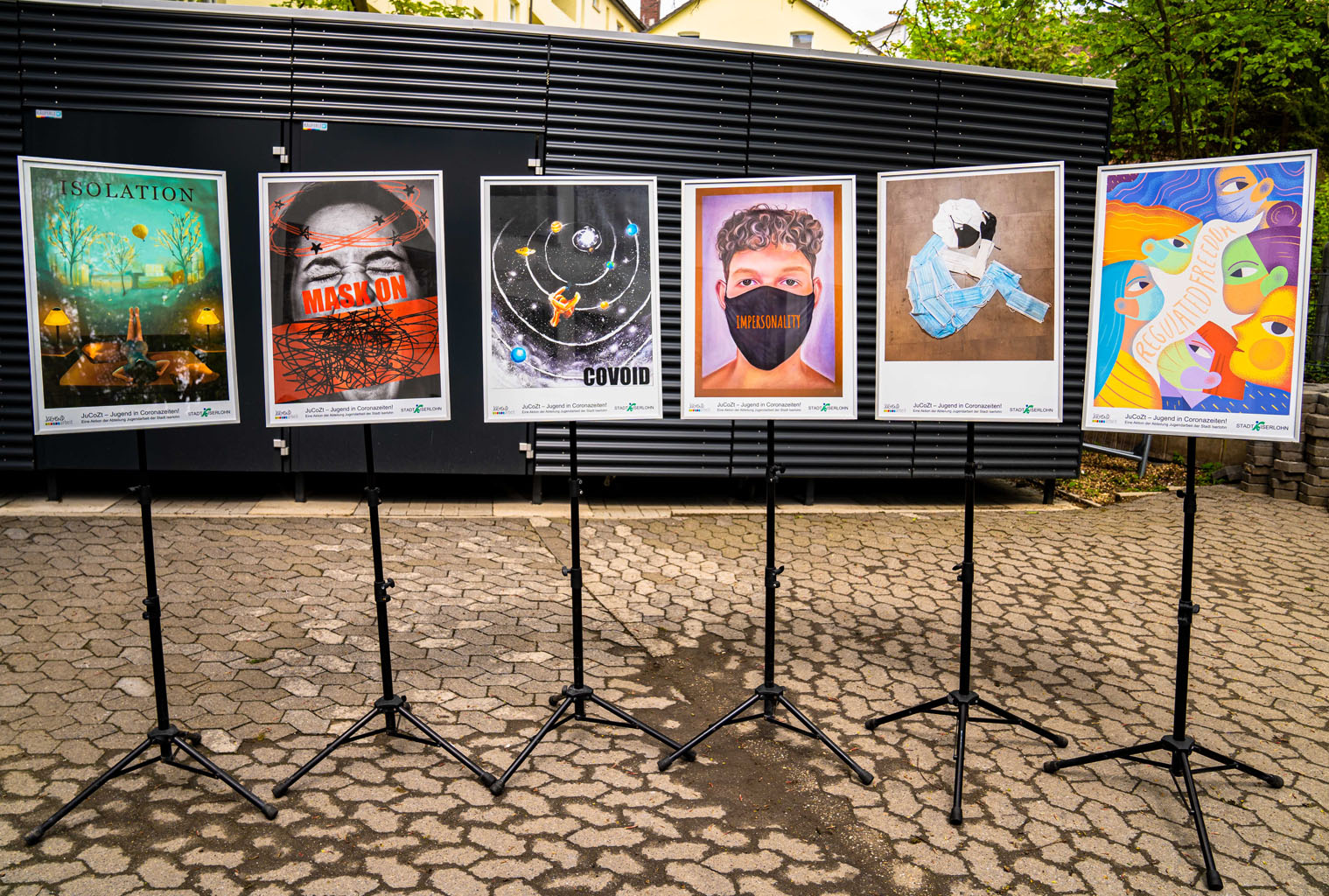 Die Siegerplakate werden im Jugendamt im Hansahaus ausgestellt (v.l.): „Isolation“ (1. Platz), „MASK ON“ (2. Platz), „Covoid“ (3. Platz), „Impersonality“ und, „Maskenmännchen“ (je 4. Platz) und „Regulated Freedom“ (5. Platz).