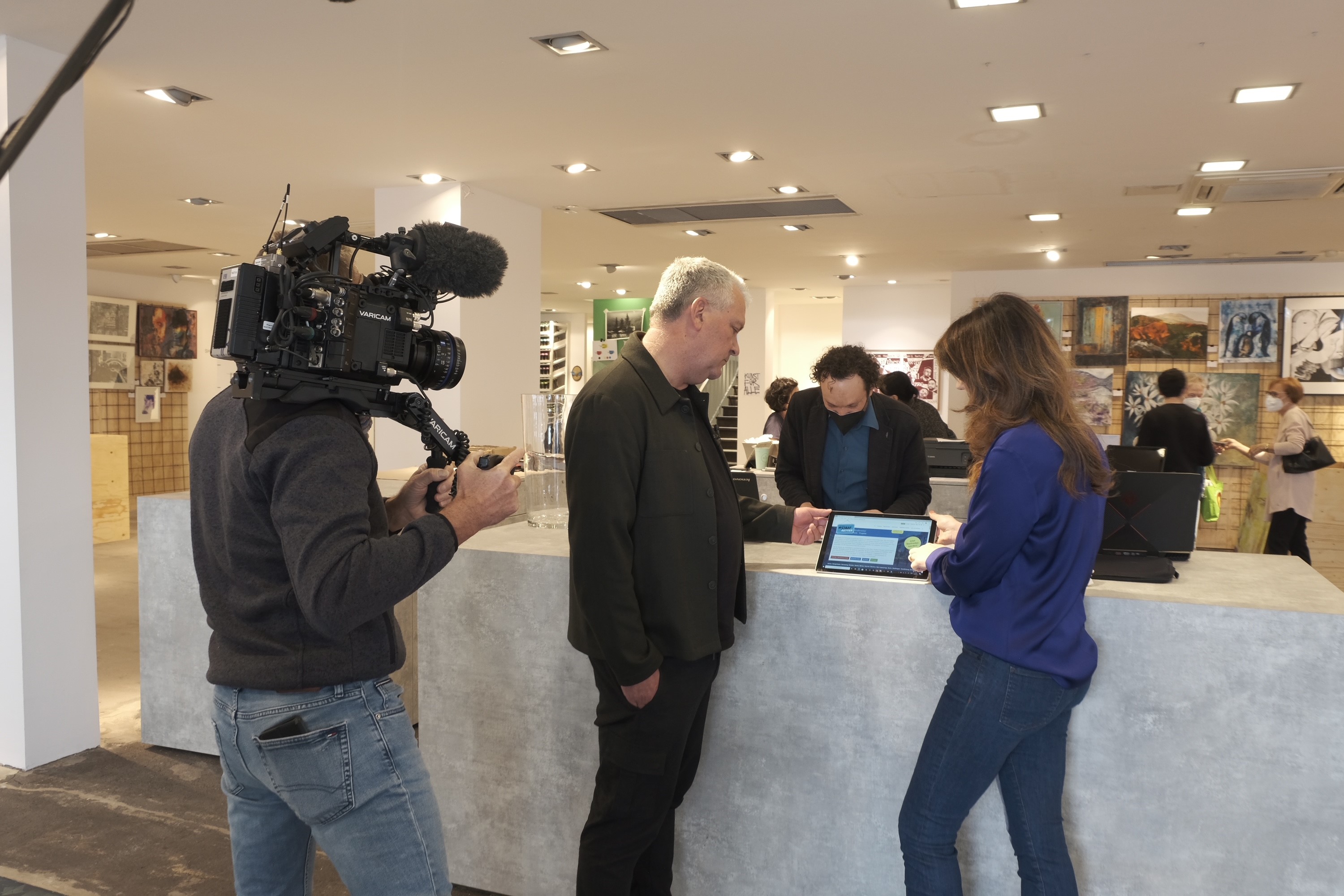 Stadtentwickler Martin Bieberle und Ariana Breuer von der Initiative "Stadtretter" erläutern im KunstKaufLADEN Tacheles neue Ideen für die Innenstadtentwicklung. (Hinweis für die Redaktionen: Alle an den Dreharbeiten Beteiligten haben sich im Vorfeld einem Corona-Test unterzogen)