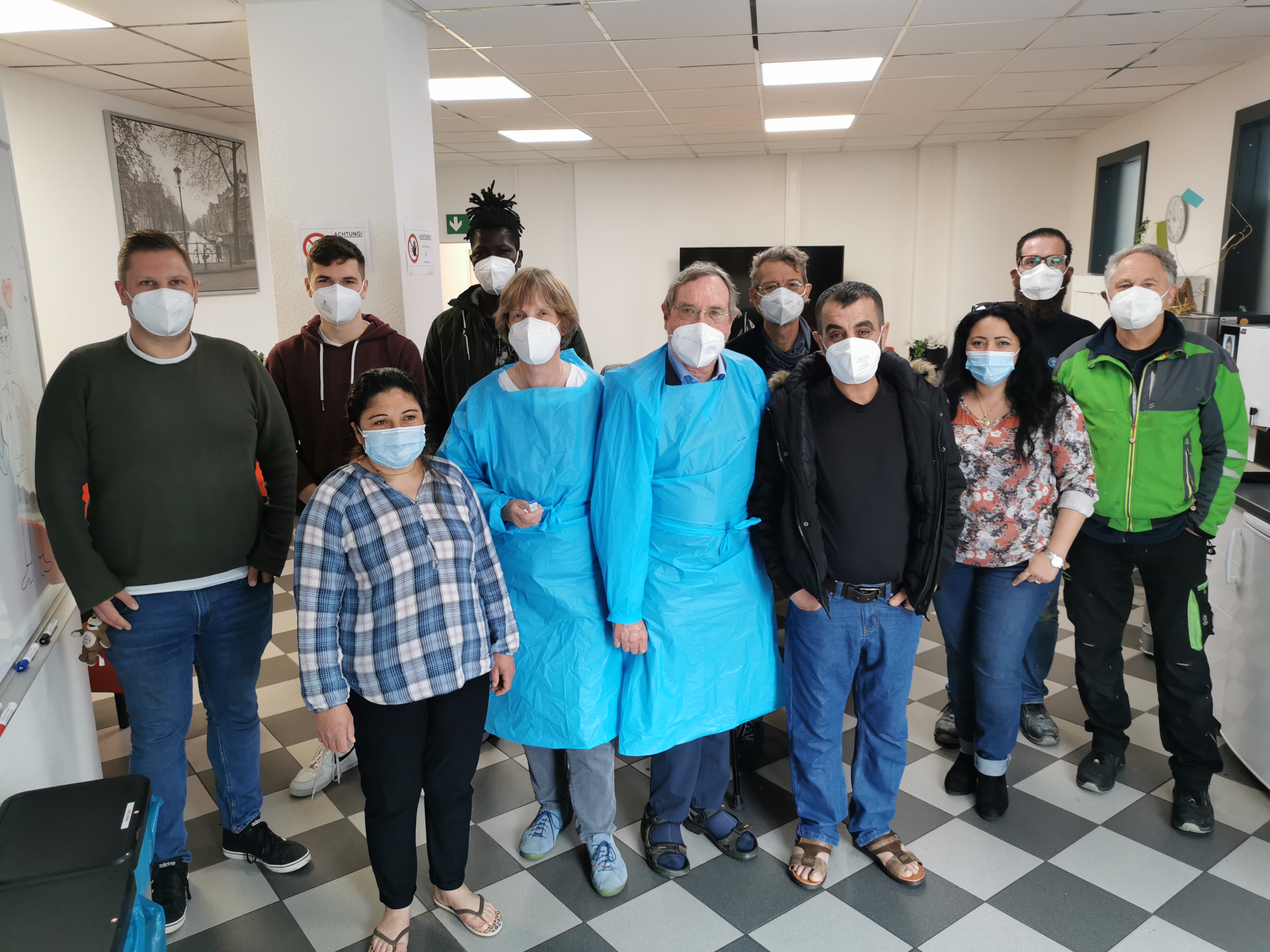 Dr. Adam und seine Ehefrau (blaue Schutzkittel) impften jetzt im "Haus der Integration" geflüchtete Menschen und Mitarbeiterinnen und Mitarbeiter der EWIBO gegen das Coronavirus.