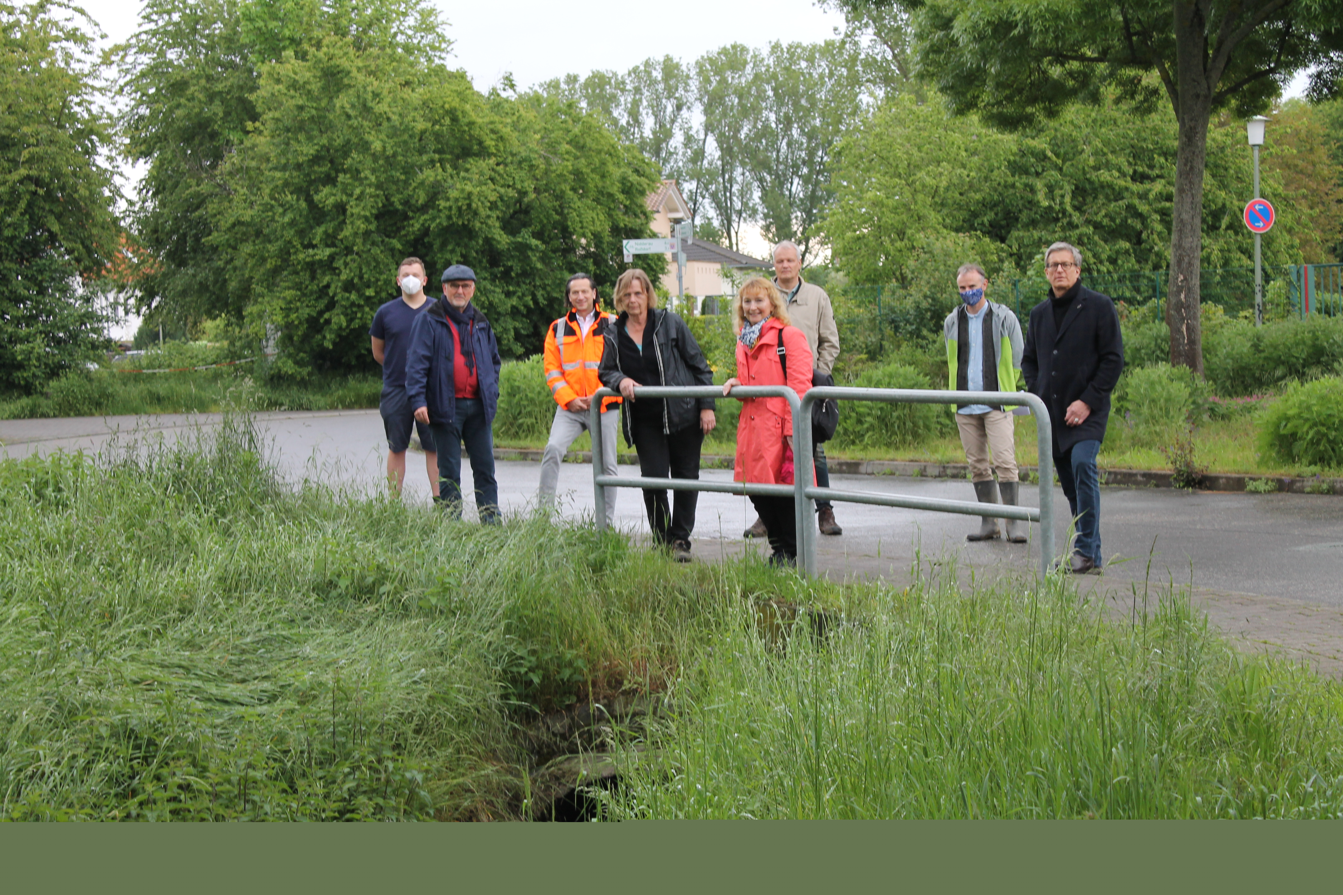 Ortsvorsteherin Caroline Geier-Roth (vorne rechts) und Ortslandwirtin Ilse Bader (vorne links) ließen sich über den Stand der Arbeiten informieren von: Stadtrat Thomas Morlock, Projektleiter Christian Fischer vom beauftragten Planungsbüro, Michael Böwingloh von der gleichnamigen Baufirma, HIS-Betriebsleiter Markus Henrich und HIS-Fachmann Michael Ruess (von rechts).