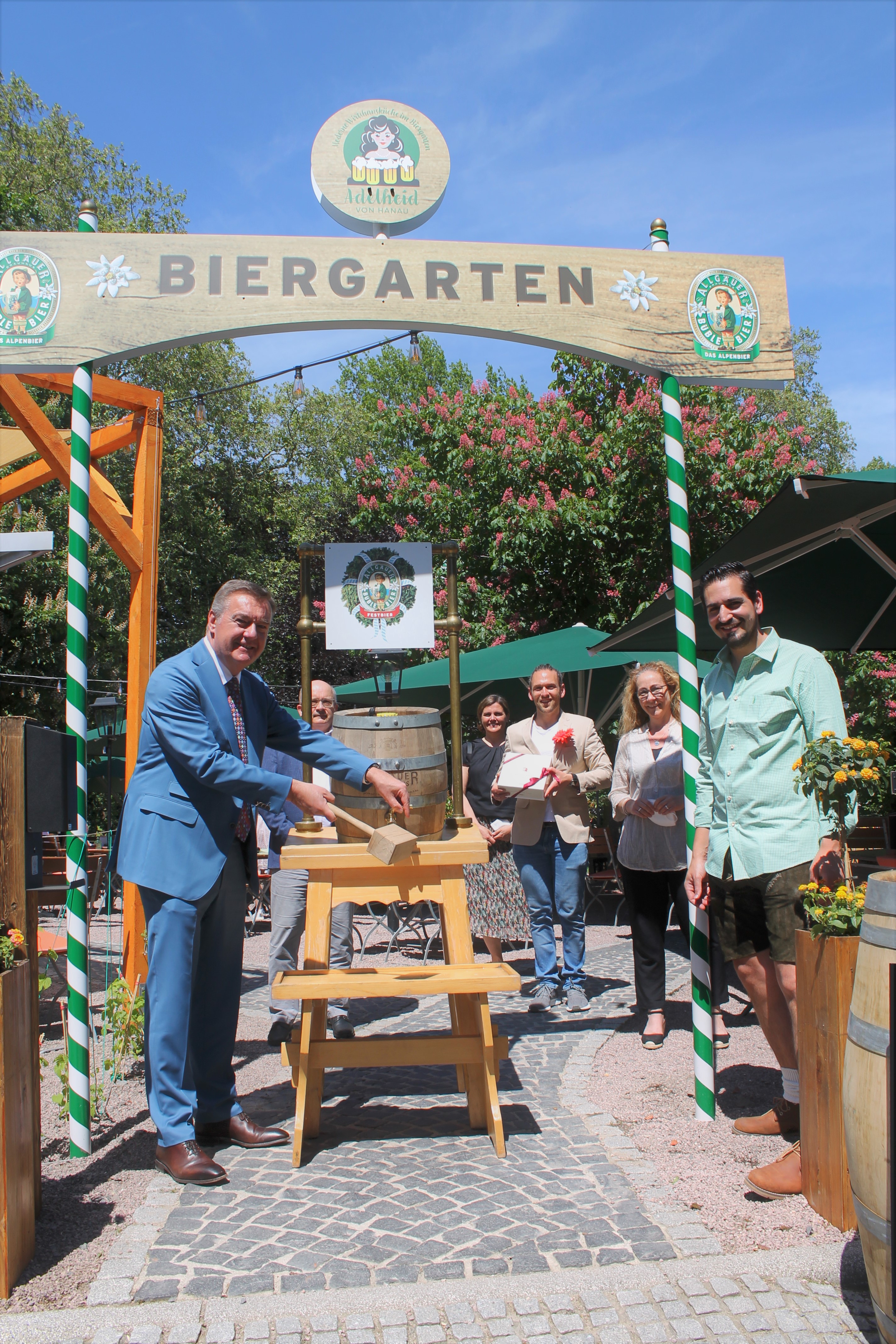 Symbolischer Fassanstich von OB Claus Kaminsky (ganz links) zusammen mit Daniel Schmidt, Nicole Rautenberg, Maximilian Hirsch (wie Schmidt BUMB JUNIORS) , Sabine Maiwald-Wolf (CPH) und Andreas Völker, Gebietsleiter der Radeberger Brauerei-Gruppe (von rechts).