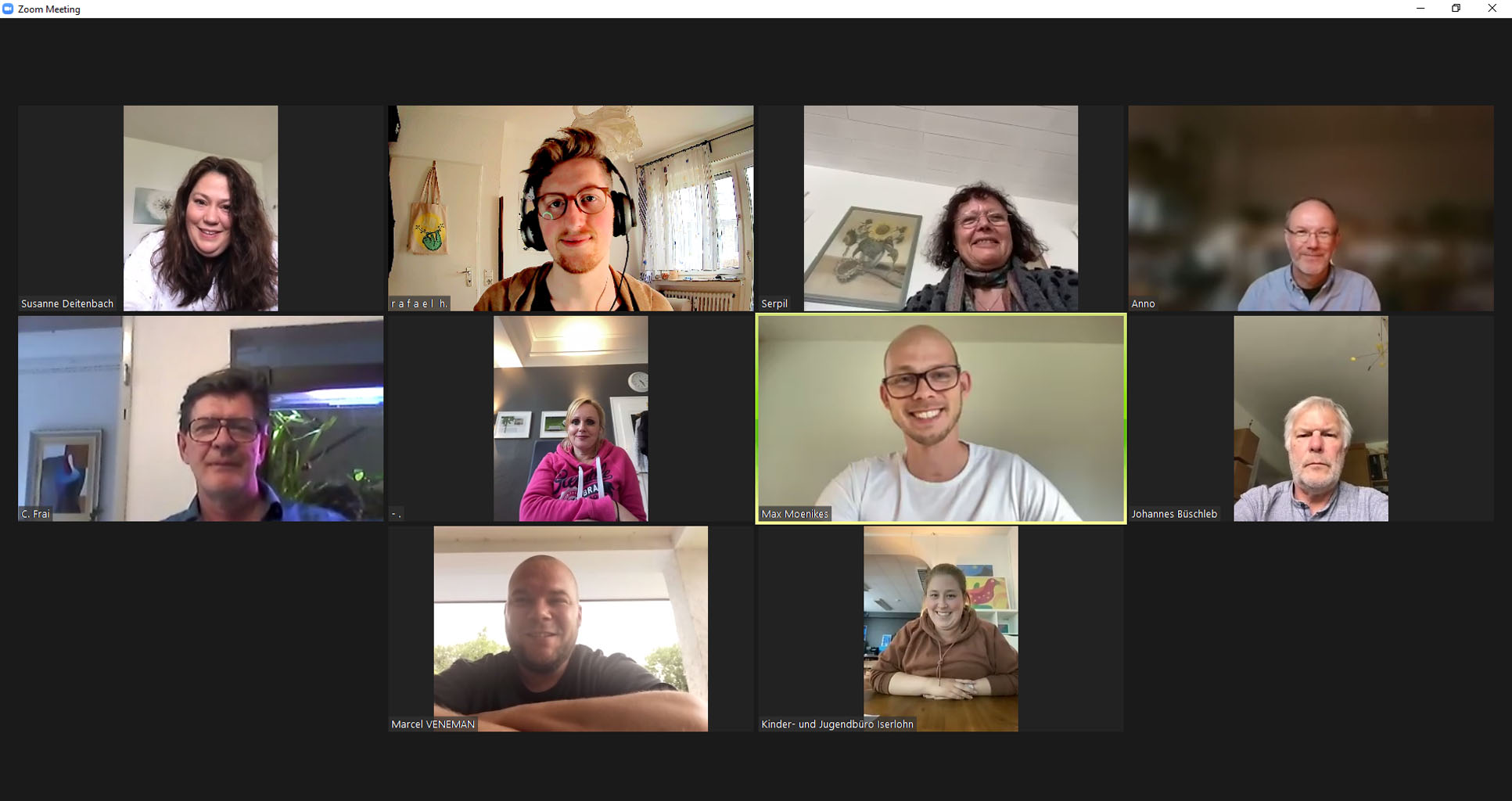 Einige der teilnehmenden Künstler und Mitarbeiterinnen des Kinder- und Jugendbüros trafen sich in einem Video-Meeting zur Vorstellung der diesjährigen Aktion „Kids & Kunst in Iserlohn – Kunstorte beleben die Stadt“ (v.l. oben): Susanne Deitenbach, Rafael Hengelbrock, Serpil Neuhaus, Anno Weihs, Christian Frai, Katja Rautenstrauch, Max Moenikes, Johannes Büschleb, Marcel Veneman und Kirstine Adebahr.