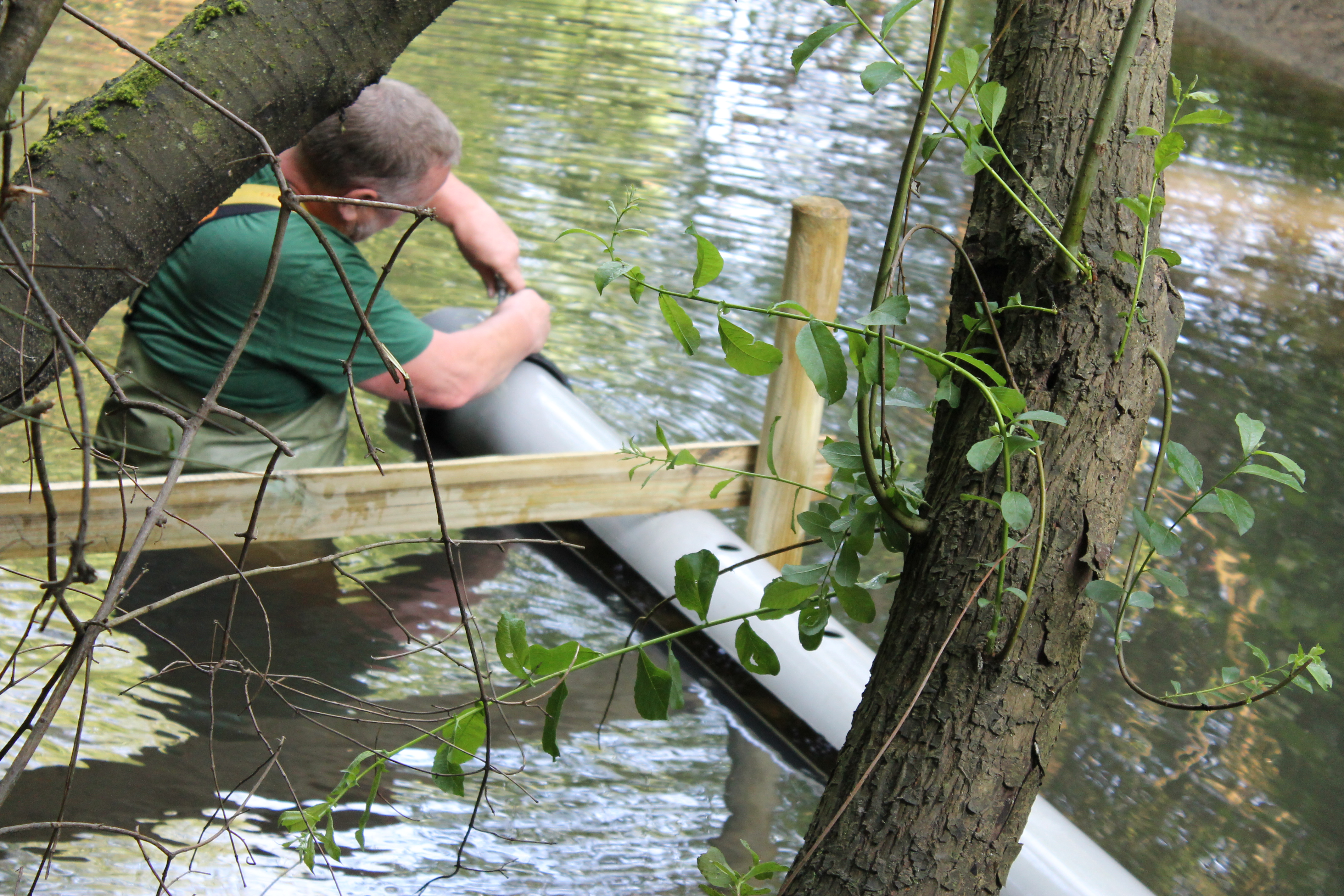 Jürgen Minnert verschließt ein Rohrende zum Schutz des Bibers. Das Rohr hat für den Wasserdurchfluss statt dessen einen längeren seitlichen Schlitz