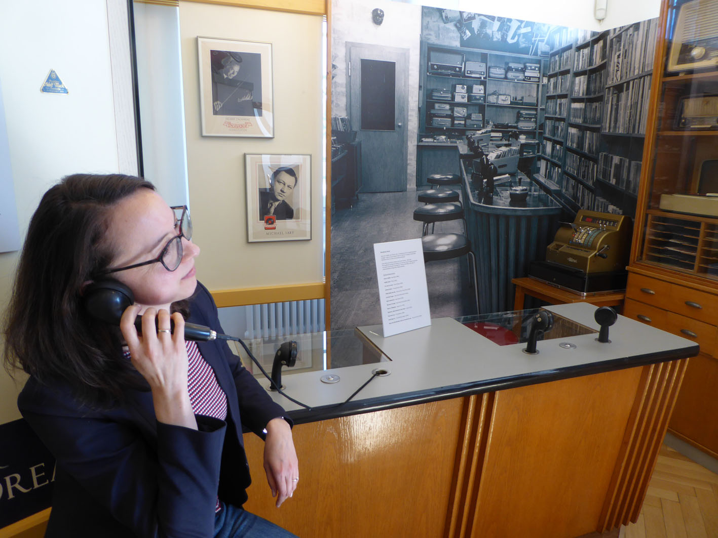 An der historischen Theke aus dem früheren Musikhaus Muck können Museumsbesucher in zehn verschiedene „Klassiker“ und „Schnulzen“ hineinhören.