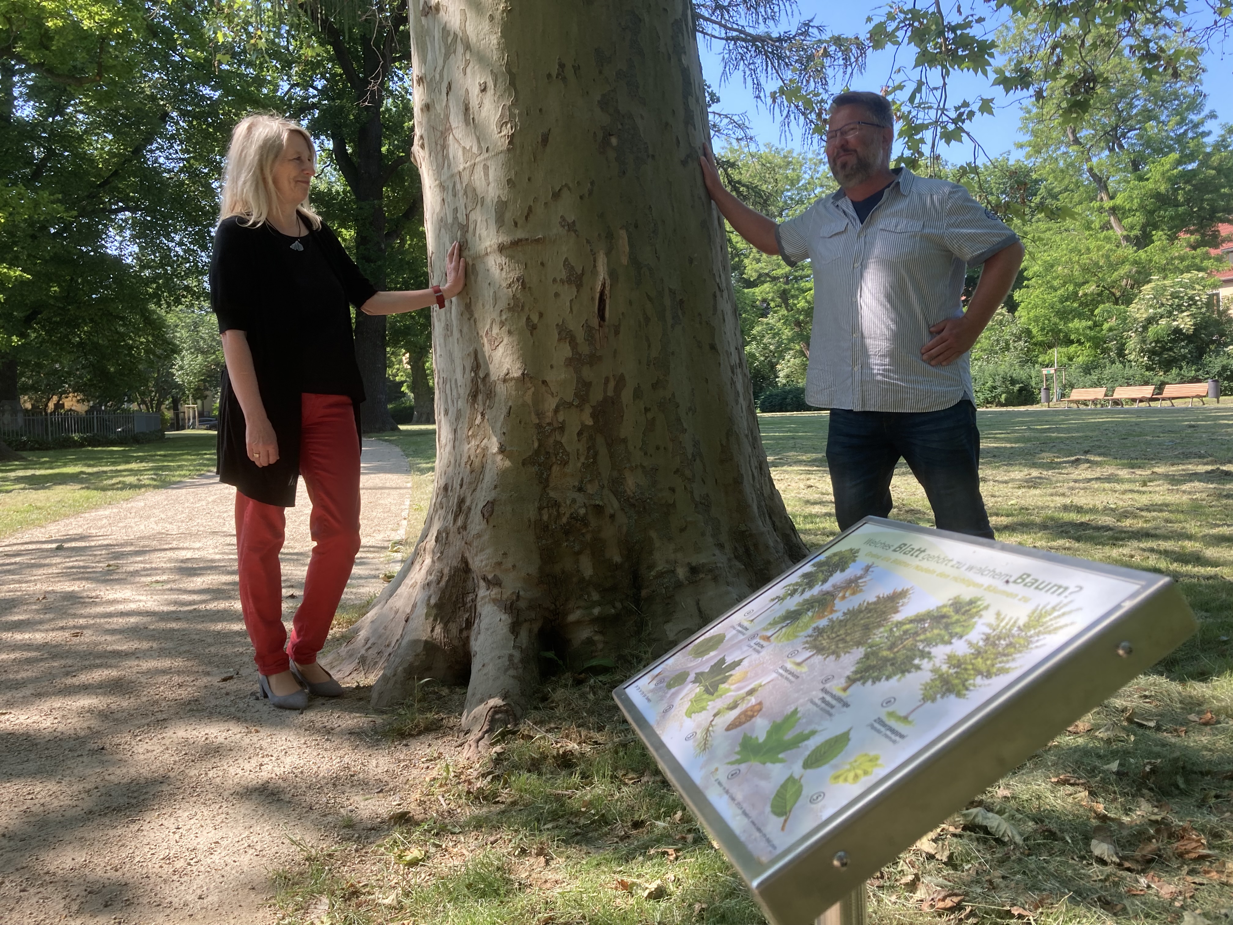 Leiterin des Eigenbetriebes Stadtgarten und Friedhöfe Magdeburg, Simone Andruscheck, und Spielplatzpate Oliver Müller mit einer Schautafel.