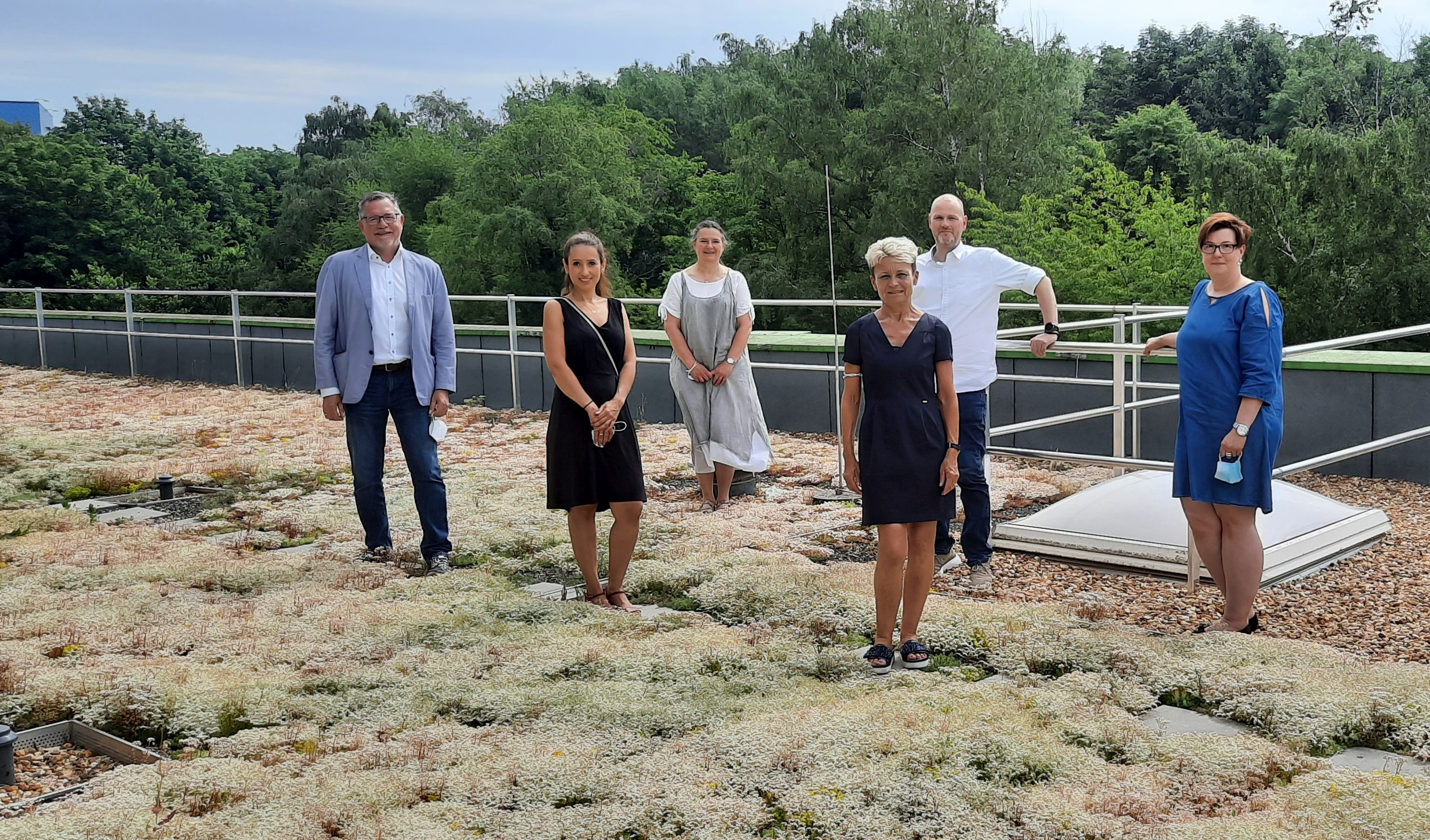 Kletterten zum Einjährigen aufs Dach, um die Begrünung zu inspizieren (v.li.): Markus Werntgen-Orman (Leiter Bereich Umweltschutz Stadt Oberhausen, Samaneh Naseri (Emschergenossenschaft), Dr. Angela Sabac-el-Cher (GMVA-Geschäftsführerin), Anja Strompen-Mank (Assistenz GMVA-Geschäftsführung), Maik Ballmann (Bereich Umweltschutz) und Julia Kremser (Assistenz GMVA-Geschäftsführung).