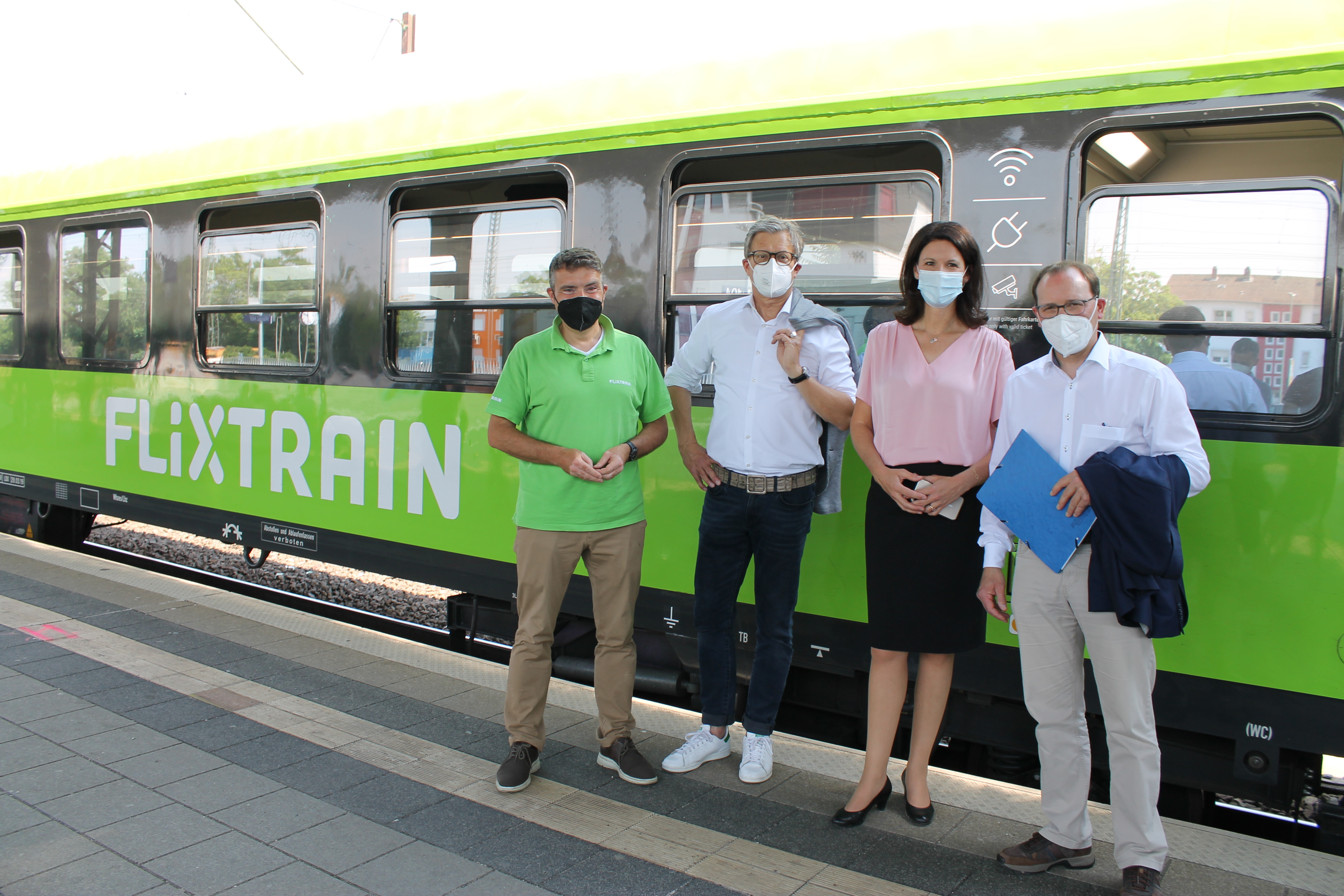 Begrüßung auf Bahnsteig 102 des Hanauer Hauptbahnhofs anlässlich der Premierenfahrt: Patrick Kurth von FlixTrain, Stadtrat Thomas Morlock, die CDU-Bundestagsabgeordnete Katja Leikert und der Aschaffenburger FDP-Bundestagsabgeordneter Karsten Klein (von links).