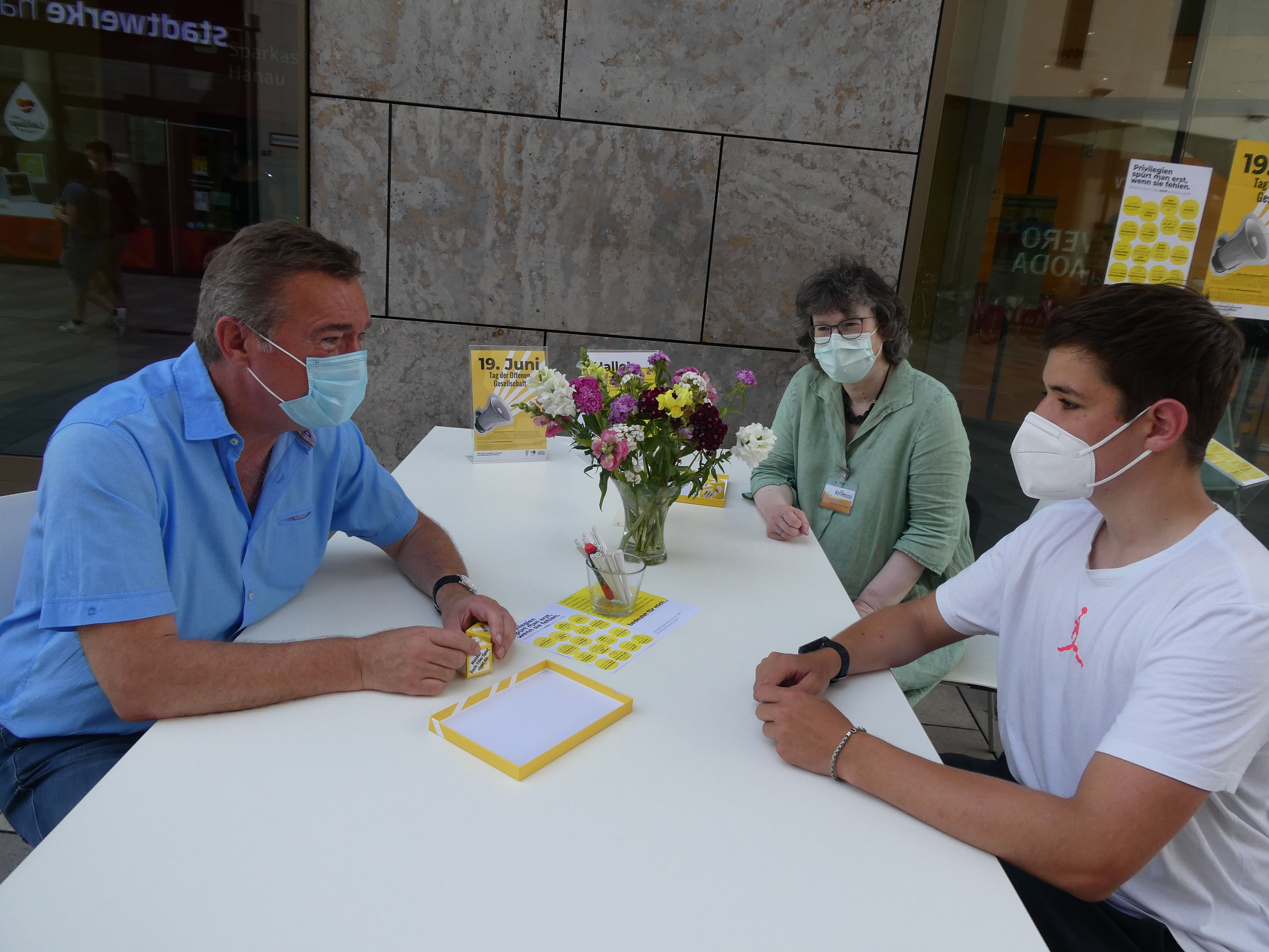 Wozu brauchen wir Freiheit? Über diese Frage diskutierte OB Claus Kaminsky mit Janiv Döring (vorne rechts) und Kulturforum-Leiterin Beate Schwartz-Simon (hinten rechts).