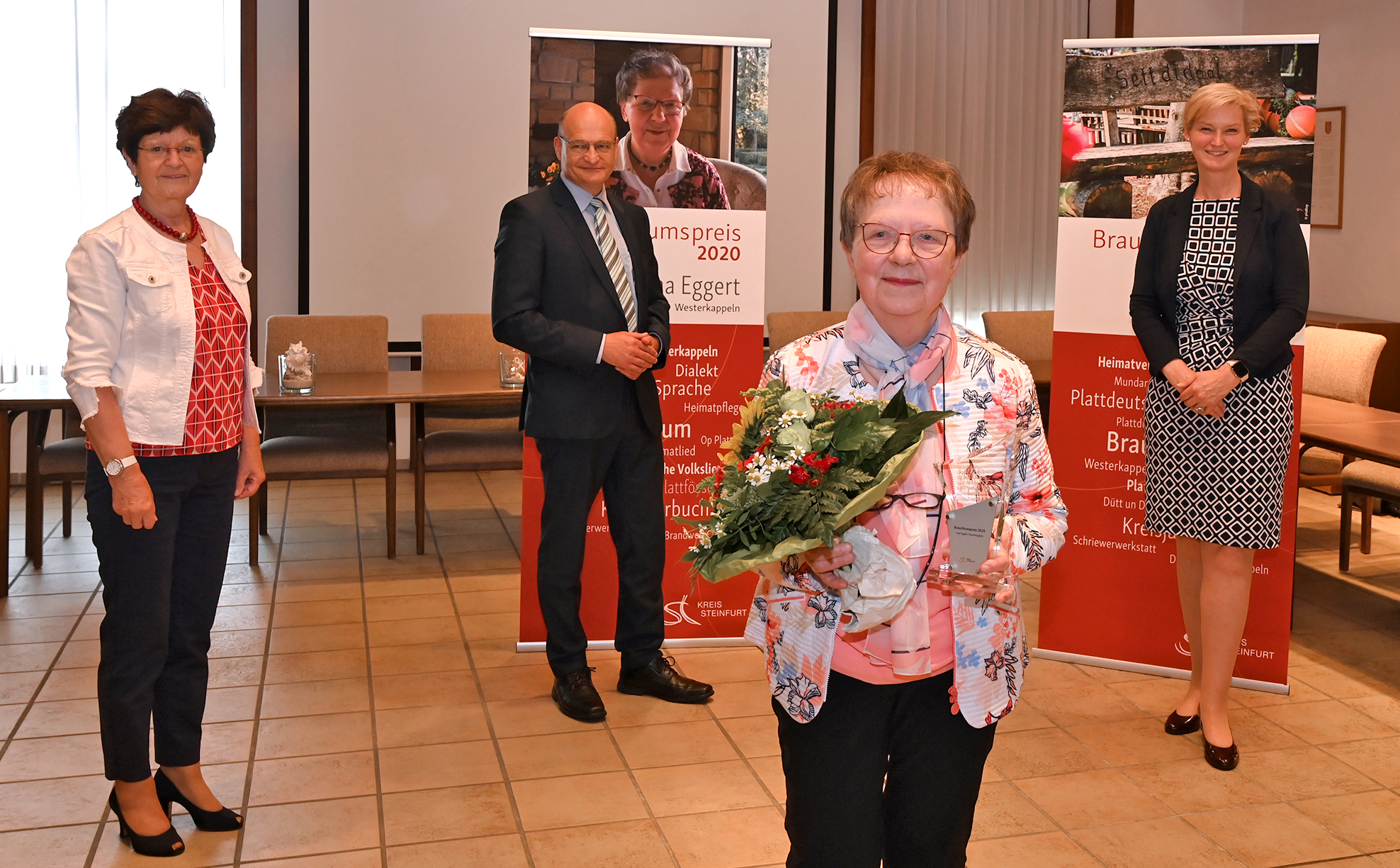Gratulierten Irma Eggert zum Brauchtumspreis des Kreises Steinfurt 2020 (v. l.): Reinhild Finke, Vorstandsvorsitzende des Kreisheimatbundes Steinfurt, Landrat Dr. Martin Sommer und Westerkapplens Bürgermeisterin Annette Große-Heitmeyer.