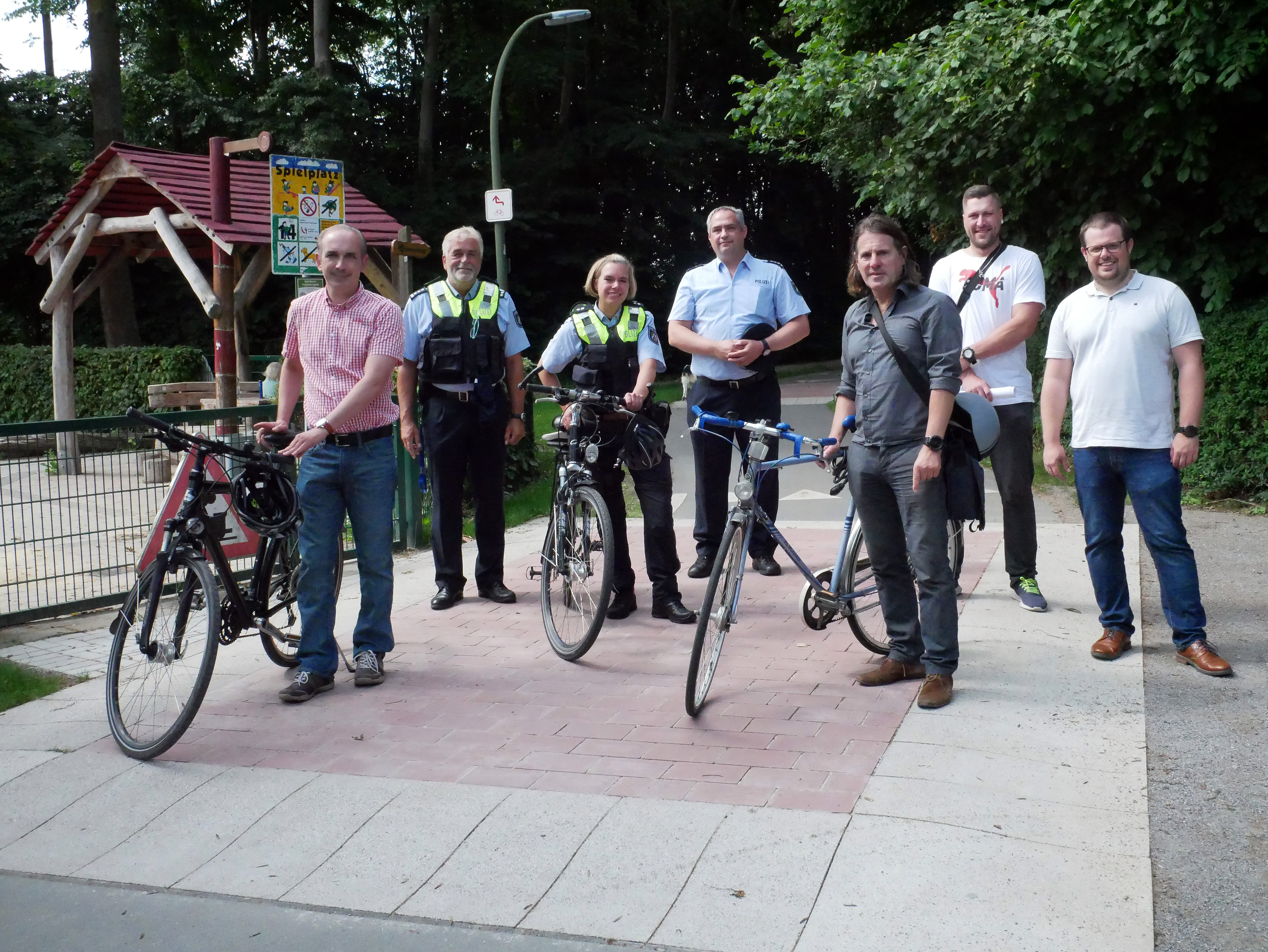 Bildzeile 1: Auftakt der Serie „Radfahren – Aber sicher!“ am Alleenradweg in Bönen mit (v.l.): Michael Arnold (Straßenverkehrsbehörde Kreis Unna), Thomas Stoltefuß (Erster Polizeihauptkommissar, Leiter des Verkehrsdienstes der KPB), Eve Wedel (Polizeioberkommissarin, Verkehrssicherheitsberaterin KPB), Bernd Pentrop (Polizeihauptkommissar und Leiter der Pressestelle der KPB), Holger Middelmann (Fachbereich Bauen Kreis Unna), Rene Böhm ( Klimaschutzmanager Gemeinde Bönen) und Maximilian Drexler (Radfahrbeauftragter Gemeinde Bönen). Foto: Birgit Kalle – Kreis Unna