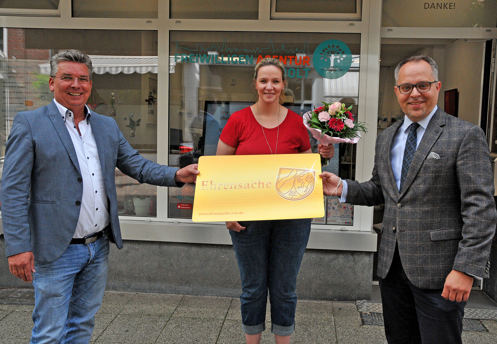 Rainer Howestädt, Ehrenamtskoordinator der Stadt Bocholt, Jennifer Roters, Inhaberin der 555. Ehrenamtskarte der Stadt Bocholt und Bürgermeister Thomas Kerkhoff, v.l.n.r. - Foto: Bruno Wansing, Stadt Bocholt