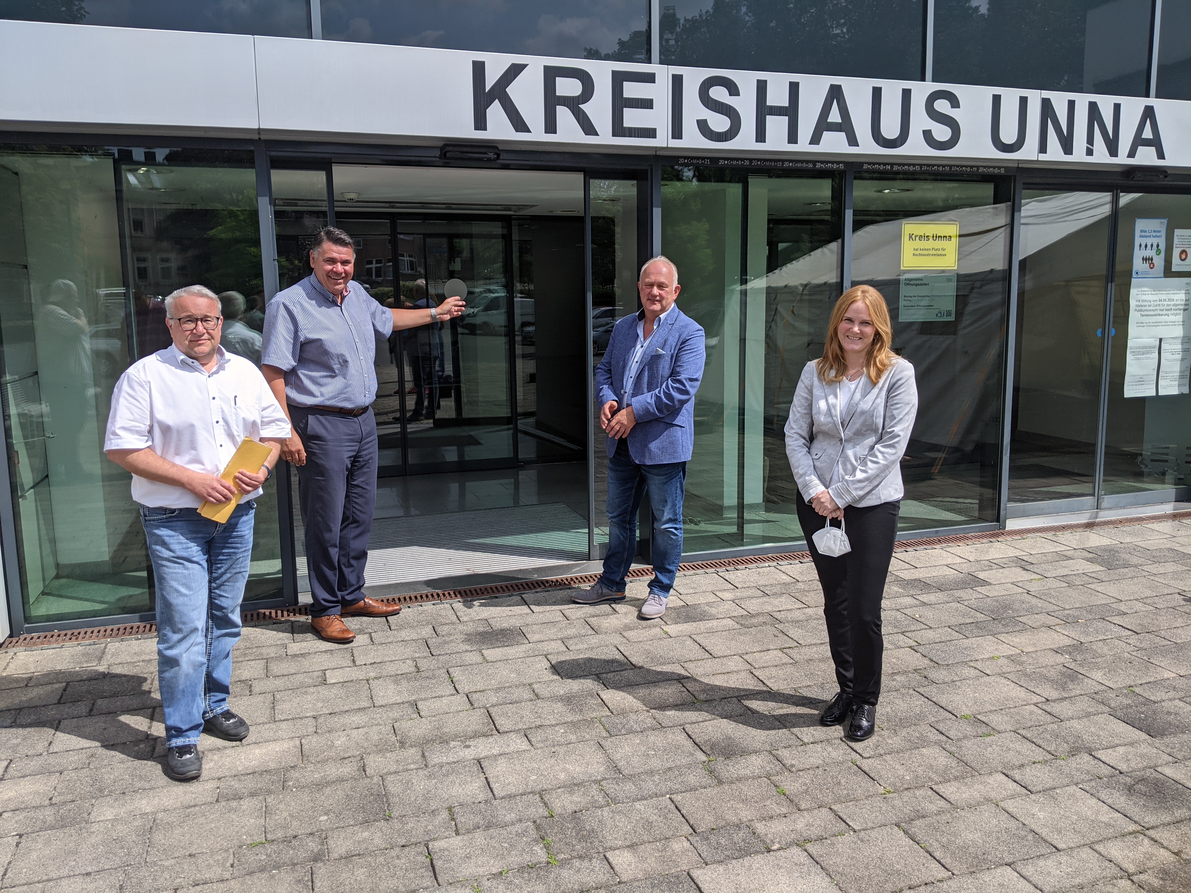 Von links: Dezernent Uwe Hasche, Landrat Mario Löhr, Holger Gutzeit (Leiter Zentrale Dienste) und Silke Neubert (Leiterin Zulassungsstelle) stellen den Plan zum Besuch ohne Termin ab 2. August vor. Foto Max Rolke - Kreis Unna