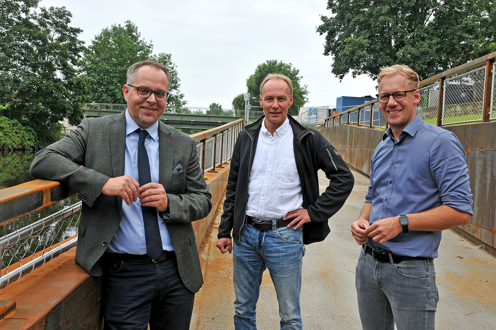 Bürgermeister Thomas Kerkhoff (links), Hans Schliesing, Leiter des Fachbereichs Mobilität und Umwelt und Stadtbaurat Daniel Zöhler (re) auf der versunkenen Brücke, die jetzt für den Verkehr freigegeben wurde - Foto: Bruno Wansing, Stadt Bocholt