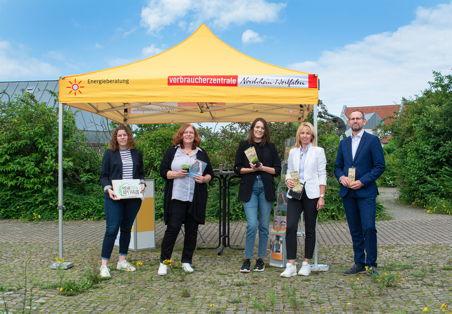 Katharina Koßmann und Birgit Stracke von der Verbraucherzentrale, Lea Schnippering und Ulrike Badziura von der städtischen Abteilung Umwelt- und Klimaschutz und Stadtbaurat Thorsten Grote (v.l.) stellten am Infotag „Rund ums Gründach“ das neue Förderprogramm vor.