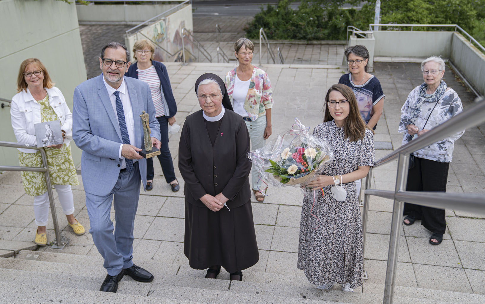 Der stellvertretende Bürgermeister Michael Scheffler übergab im Beisein von Carmen Kowski, Elke Herbeling, Anna Müller, Patricia da Cruz Santos, Christiane Müller und Charlotte Kroll (v.l.) den Fanny-van-Hees-Preis an Schwester Monika Grötz.