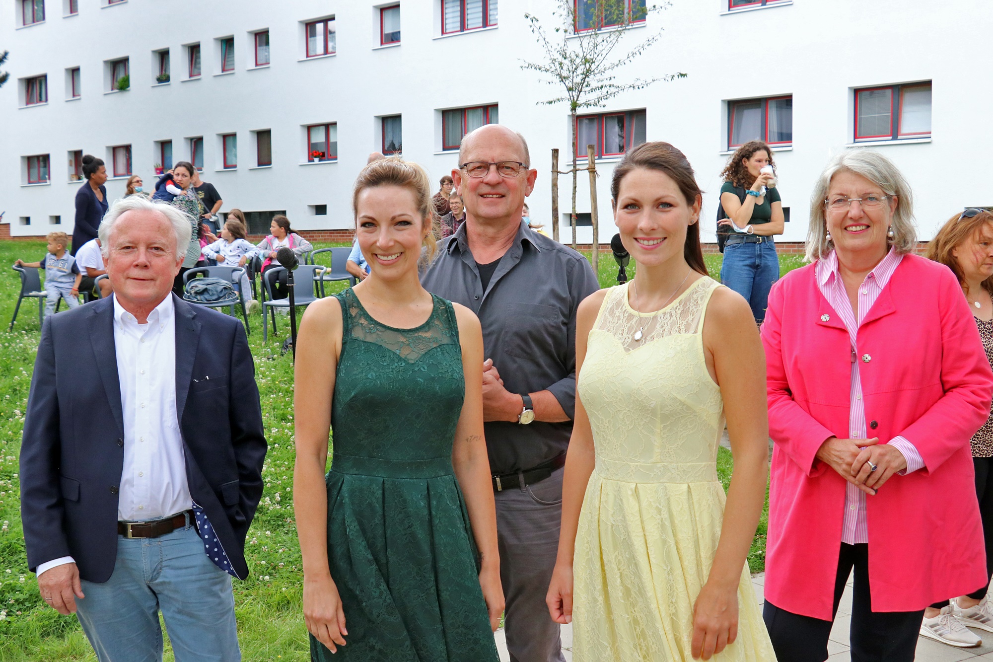 Bürgermeisterin Ilona Friedrich mit den Sängerinnen des Brüder Grimm-Festival-Teams und deren Leiter Peter Zypries sowie Peter Ley, Geschäftsführer der Gemeinnützige Wohnungsbaugesellschaft der Stadt Kassel m.b.H. (GWG), bei der Auftaktveranstaltung der Stadtteilkonzerte des Stadtteiltreffs Rothenberg.