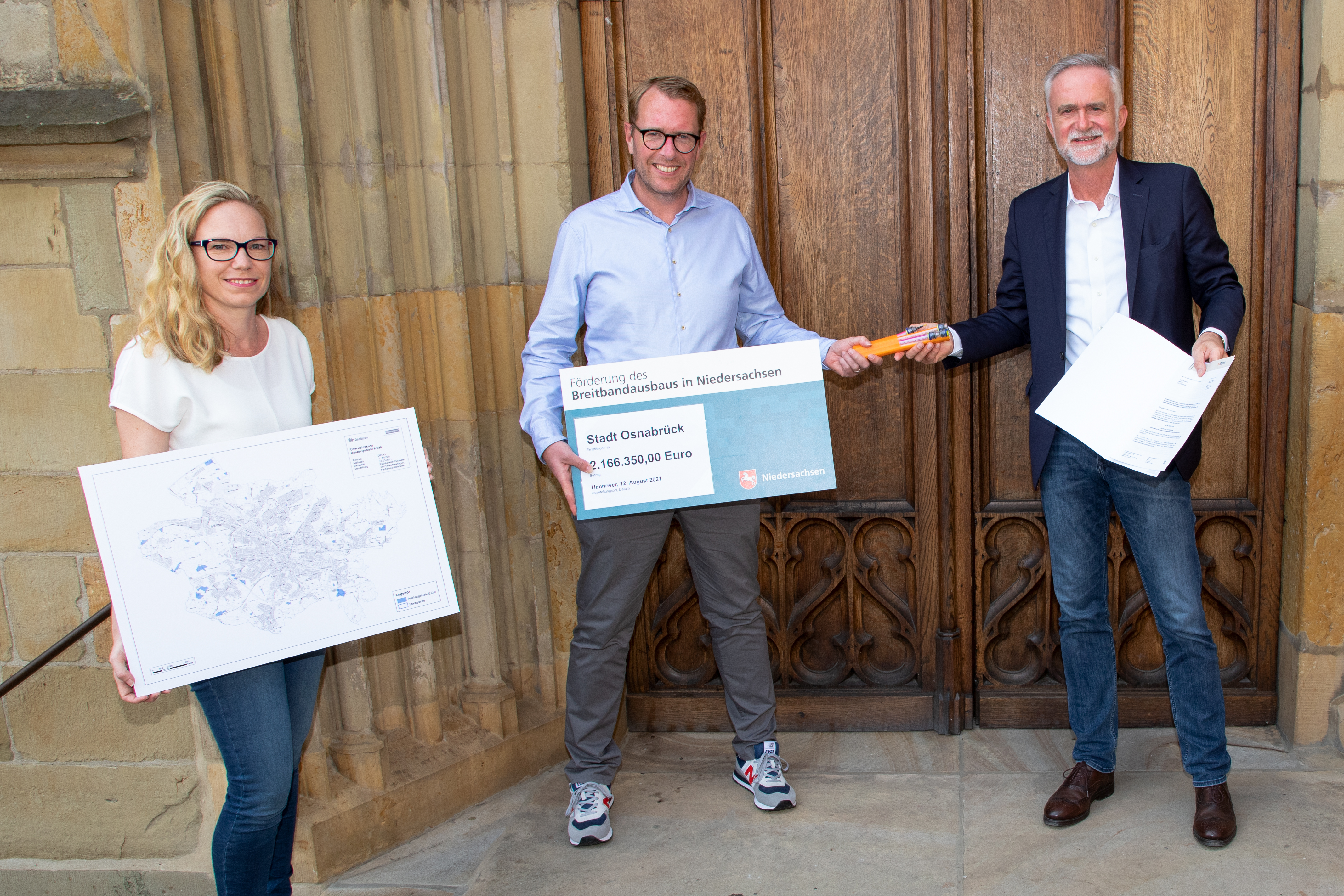 Staatssekretär Stefan Muhle (2. v.l.) übergibt Oberbürgermeister Wolfgang Griesert (rechts) den Förderbescheid in Höhe von über 2 Millionen Euro sowie symbolisch ein Glasfaserkabelbündel. Nadine Petermöller (Projektleiterin Digitale Infrastruktur) erläutert, dass in ganz Osnabrück 1600 Adressen Breitbandanschlüsse erhalten.