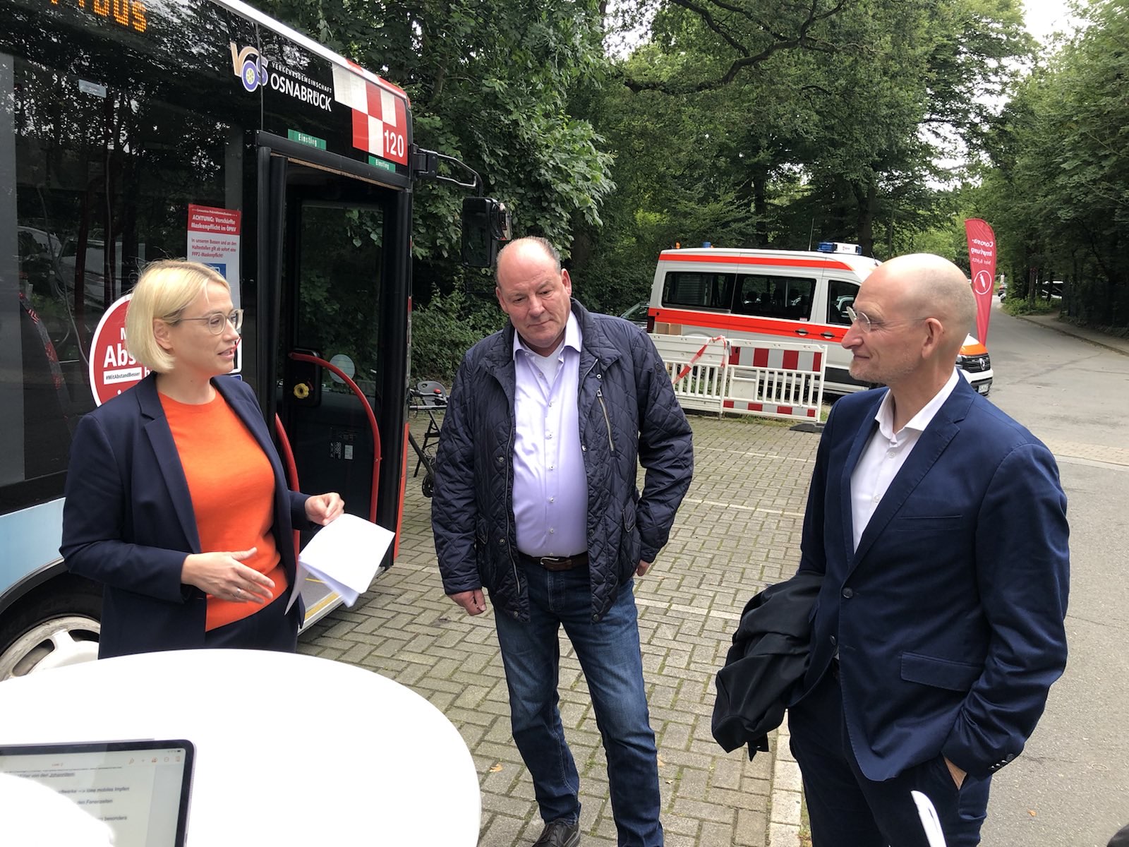 Darüber, dass der Impfbus gut angenommen wird, freuen sich (von links) Stadträtin Katharina Pötter, Kai Müller, Dienststellenleiter der Johanniter-Unfall-Hilfe Osnabrück, und Christoph Hüls, Vorstandsvorsitzender der Stadtwerke Osnabrück.
