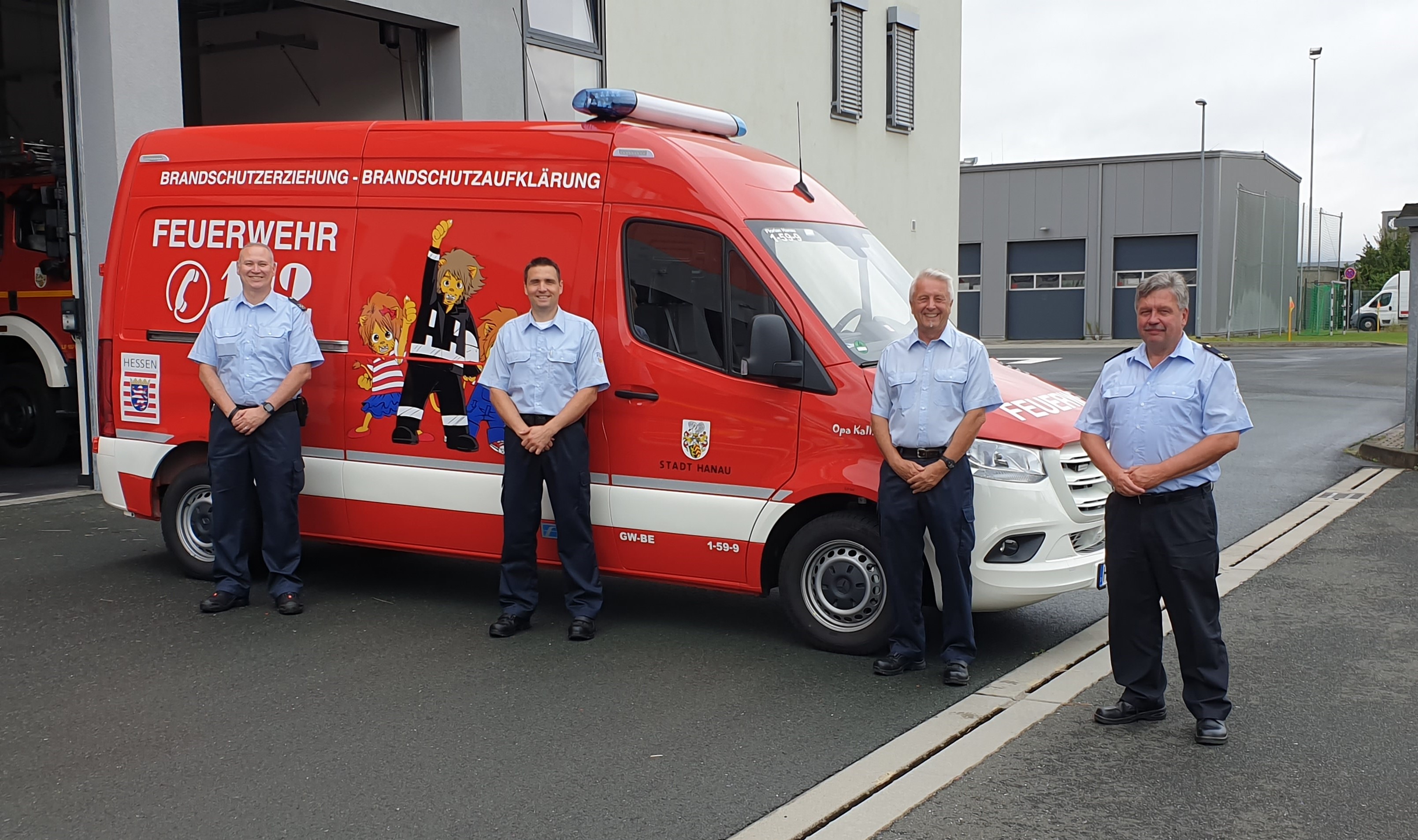 Vor dem neuen Gerätewagen für die Brandschutzerziehung verabschieden Thorsten Roth, Sebastian Mathuschik und Peter Hack den langjährigen Brandschutzerzieher Karlheinz Ladwig.