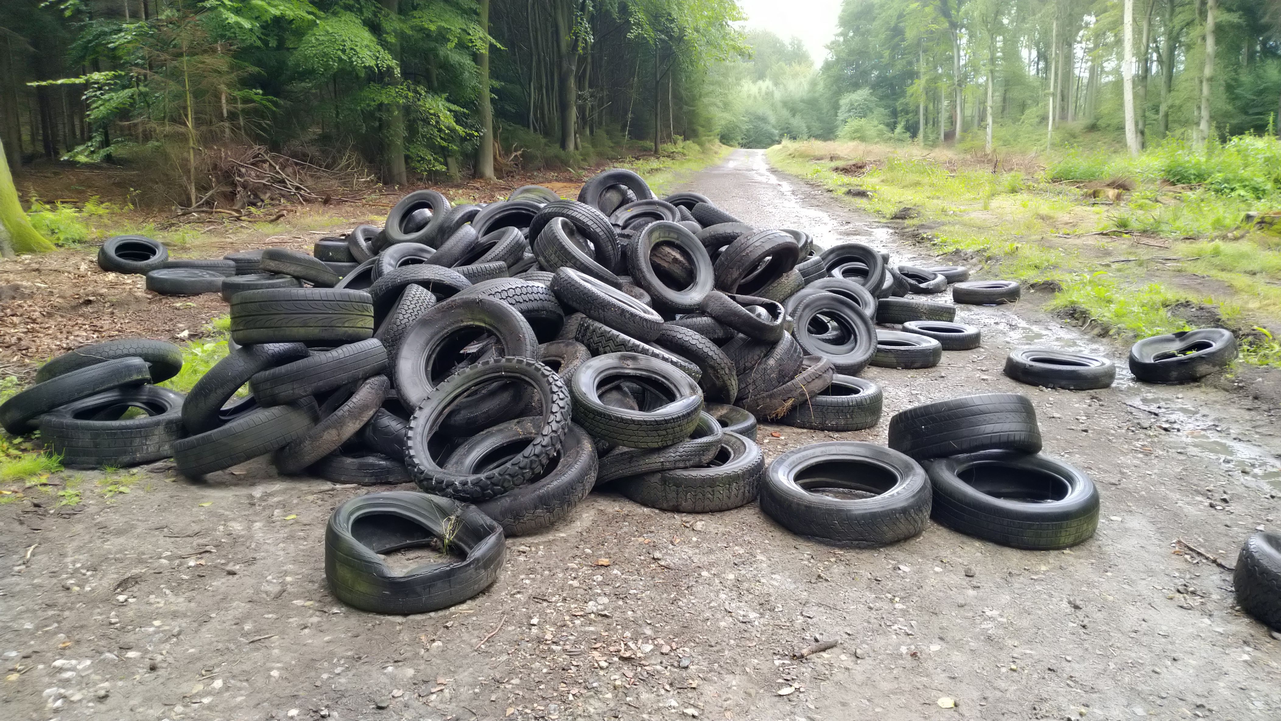 Jemand hat mehr als 100 alte Autoreifen im Wald nahe der Oldenburger Landstraße entsorgt.