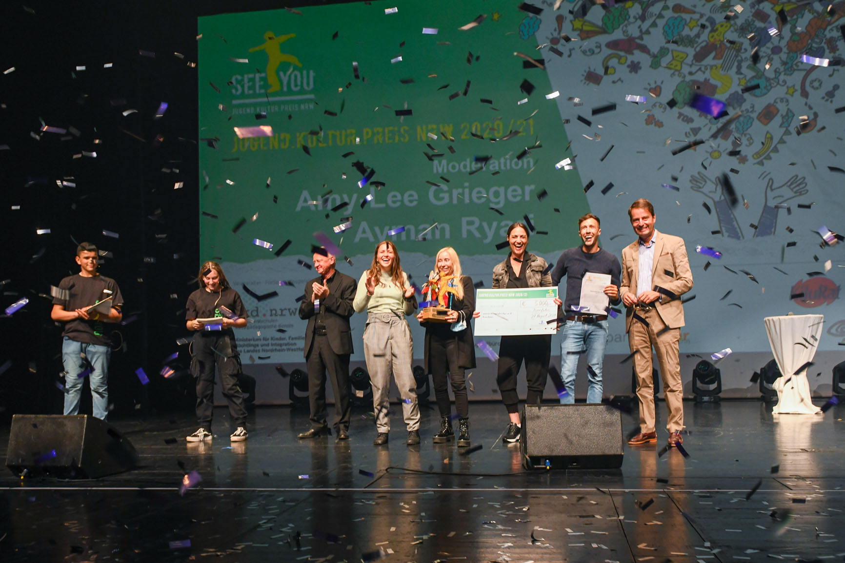 Schlussbild mit Siegern: Staatssekretär Andreas Bothe (r.) und Kurt Eichler (3.v.l.) und das Moderationsteam Ayman Ryari und Amy Lee Grieger vom Iserlohner Kinder- und Jugendrat (v.l.) rahmen die Empfänger des Ersten Preises des Vereins music4everbody! aus Frechen ein.