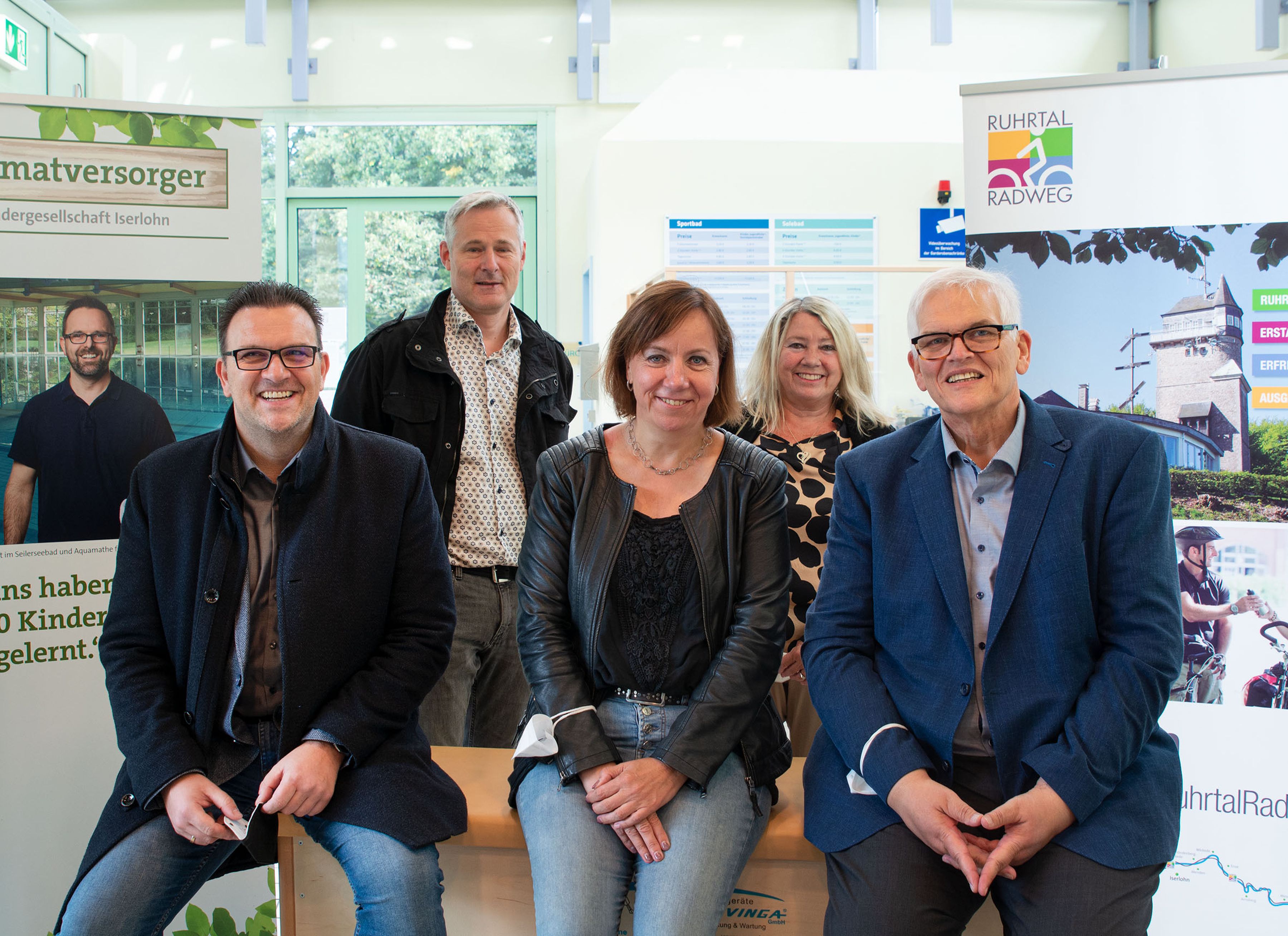 Regierungspräsident Hans-Josef Vogel (r.), Bürgermeister Michael Joithe, Tobias Hommel (Gymnasium Letmathe), Schulrätin Karin Raschke und Barbara Brühl (Gesamtschule Iserlohn) bei der Eröffnung der “Iserlohner Schulschwimmwoche” im Seilerseebad.