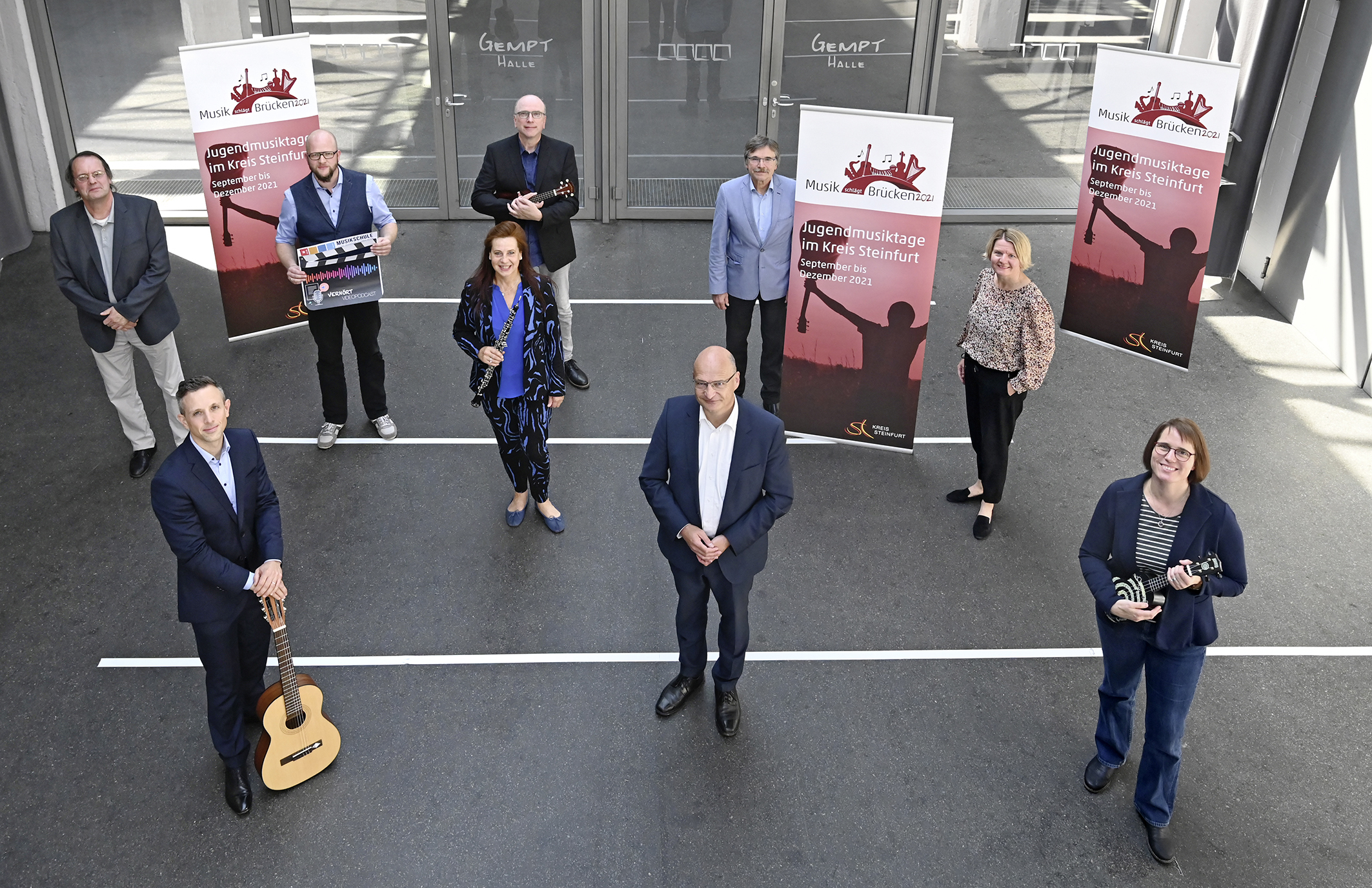 Freuen sich auf die 18. Veranstaltungsreihe "Musik schlägt Brücken", die in diesem Jahr auch analoge Angebote im Programm hat (hintere Reihe v. l.): Michael Gantke (KulturForumSteinfurt), Andreas Hermjakob (Musikschulzweckverband Ochtrup, Neuenkirchen, Wettringen, Metelen), Michael Biewald mit Ukulele (Musikschule Rheine), Bürgermeister Wilhelm Möhrke, Kulturamtsleiterin Kirsten Weßling. Vordere Reihe v. l.: Peter Nagy mit Gitarre (Städtische Musikschule Ibbenbüren, Hörstel, Recke), Stefanie Bloch mit Oboe (Musikschule Tecklenburger Land), Dr. Martin Sommer, Sonja von Gostomski (Musikschule Greven, Emsdetten, Saerbeck).