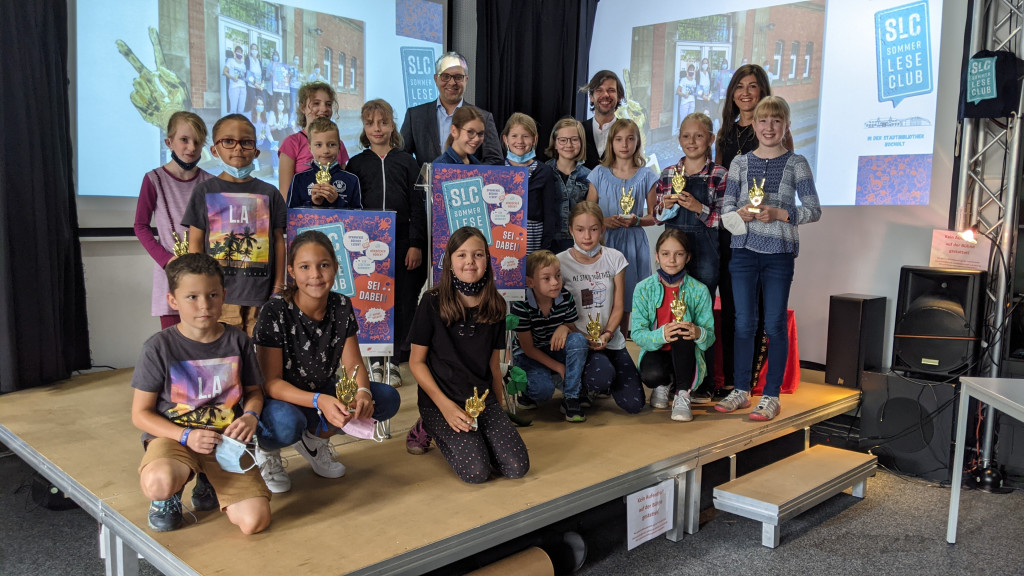 Die Gewinnerinnen und Gewinner des Sommerleseclubs 2021 freuen sich über ihre Leseoskars. Als Laudator*innen waren unter anderem Bürgermeister Thomas Kerkhoff (links) und Geschäftsbereichsleitung Isabel Testroet (rechts) anwesend.