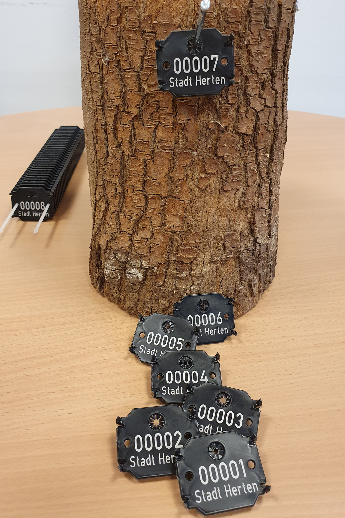 Die Nummern werden mit speziellen Nägeln durch die Rinde in das sogenannte Splintholz getrieben, damit die Bäume möglichst wenig geschädigt werden.
