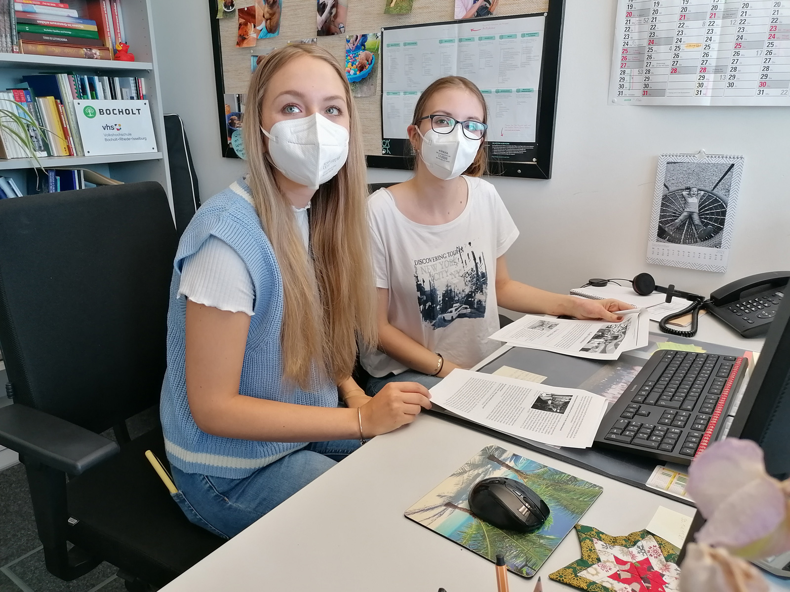 Die beiden Studentinnen Lilian Franzel (links) und Chiara Resing (rechts) absolvieren ein Tagespraktikum bei den Grenzhopperskommunen – so am 14. September 2021 bei der Stadt Bocholt.