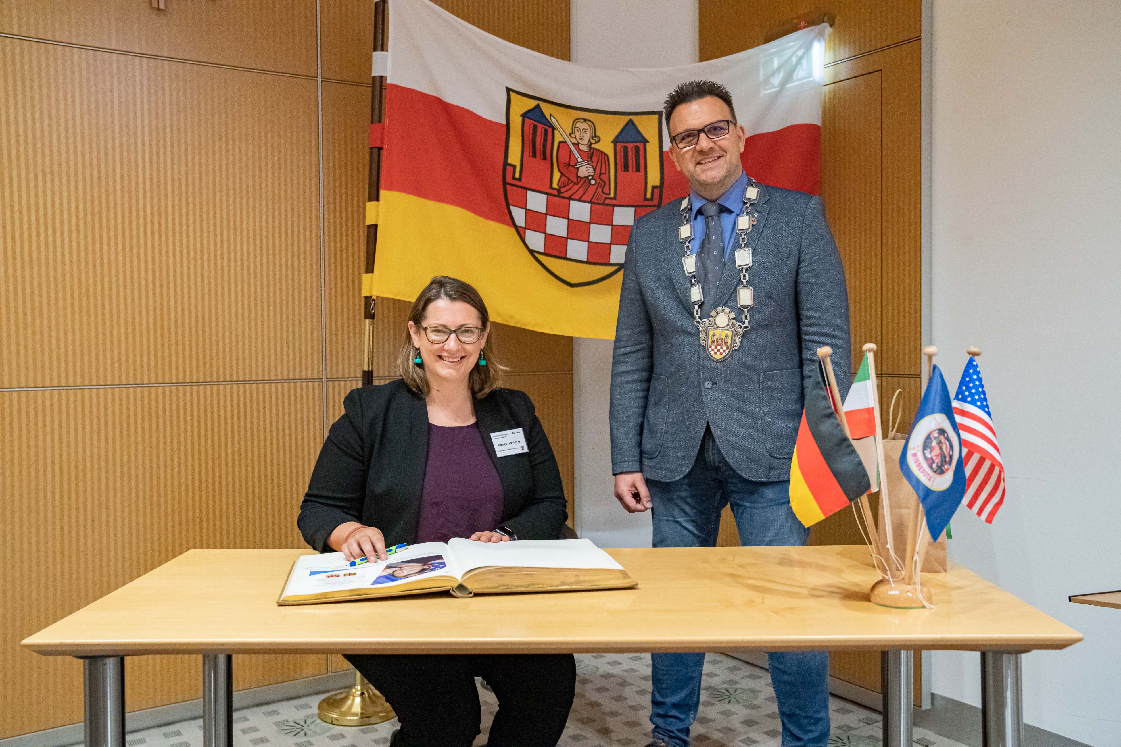 Bürgermeister Michael Joithe hieß die Gäste aus Minnesota im Iserlohner Rathaus willkommen. Wirtschaftsministerin Grace Arnold trug sich ins Goldene Buch der Stadt Iserlohn ein.