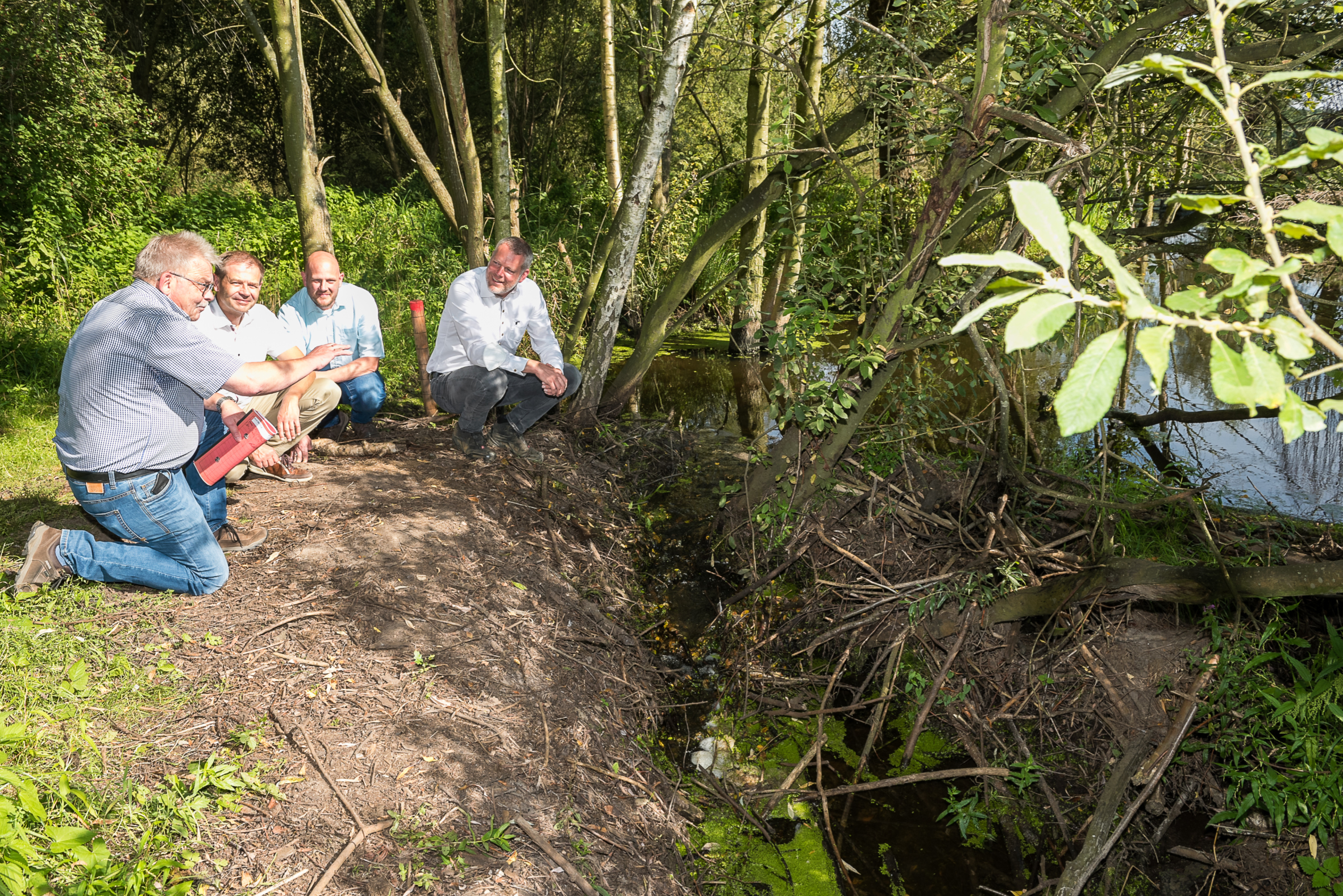 Bei der Inspektion des Biberdamms in Schwalmtal-Amern. V.l.n.r.: Reinhard Bräutigam, Dezernent Adreas Budde, Andreas Pook und Landrat Dr. Andreas Coenen.