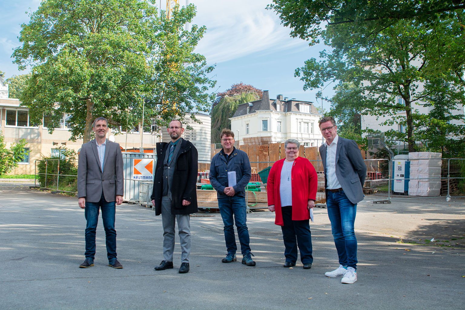 Trafen sich auf der Baustelle am Gymnasium An der Stenner um den Baufortschritt zu begutachten (v.l.): Martin Stolte, Thorsten Grote, Andreas Schultze, Claudia Zawada und der stellvertretende Schulleiter Christoph Fischer.