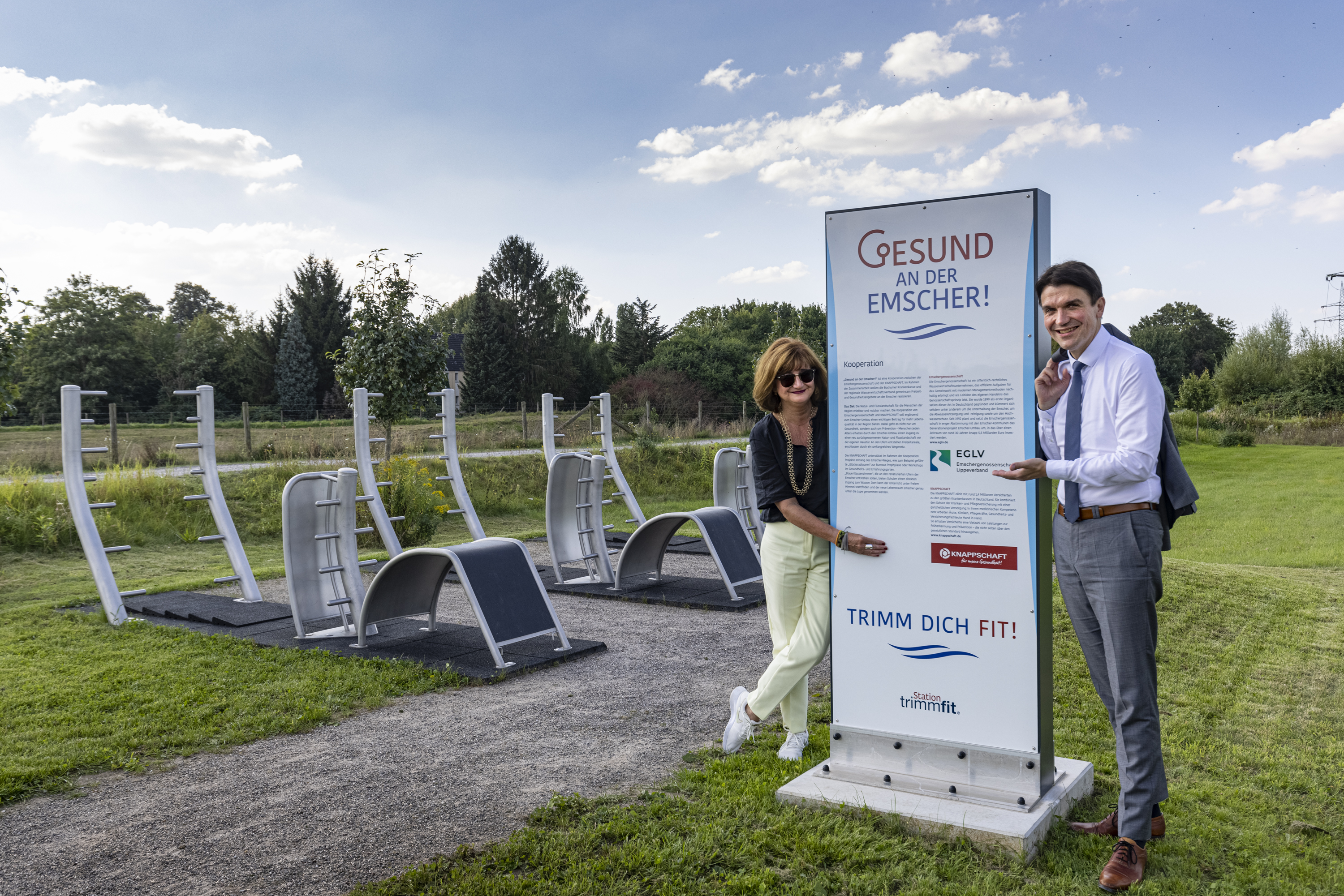 Professor Dr. Uli Paetzel, Vorstandsvorsitzender der Emschergenossenschaft, und Bettina am Orde, Geschäftsführerin der KNAPPSCHAFT, stellen die Trimm-Dich-Station vor.