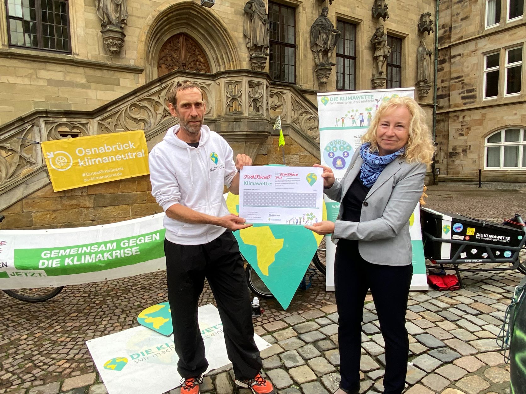 Dr. Michael Bilharz überreicht die Herausforderung zur Klimawette an Bürgermeisterin Birgit Strangmann.