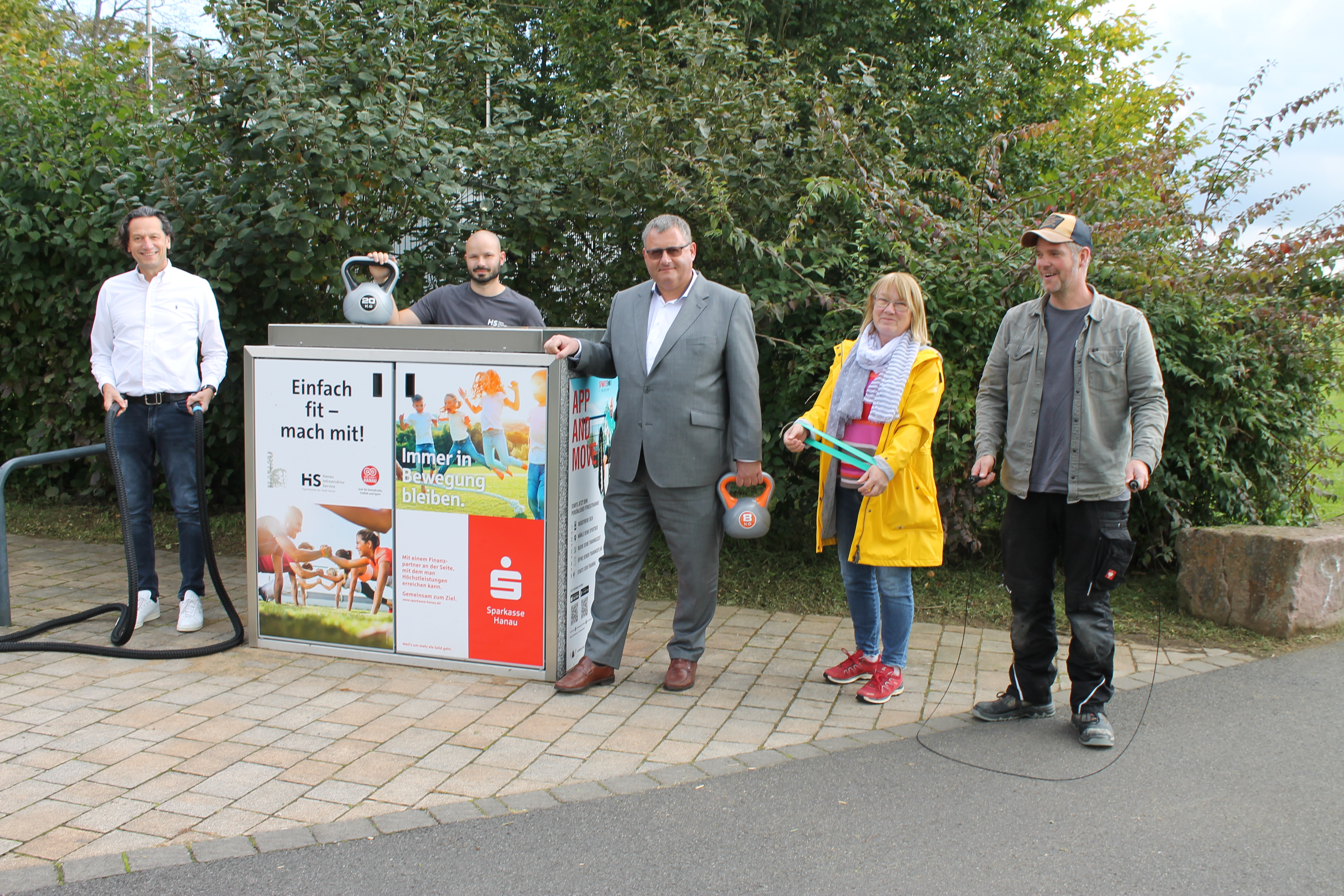 Probierten die Fitnessgeräte der SportBox gleich aus : Sparkassen-Pressesprecher Stefan Schüssler (Dritter von rechts) sowie von HIS Markus Henrich, Christian Hornung, Annerose Lösche und Kai Stolzenburg.