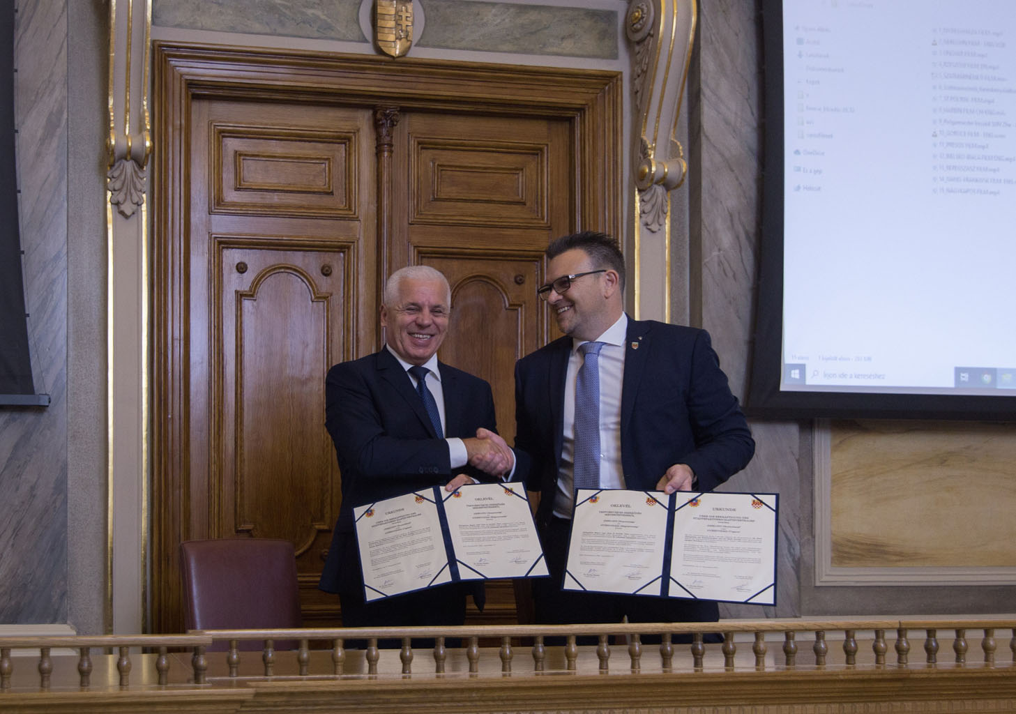 Die Bürgermeister Dr. Ferenc Kovács (l.) und Michael Joithe nach der Unterzeichnung der neuen Partnerschaftsurkunden.