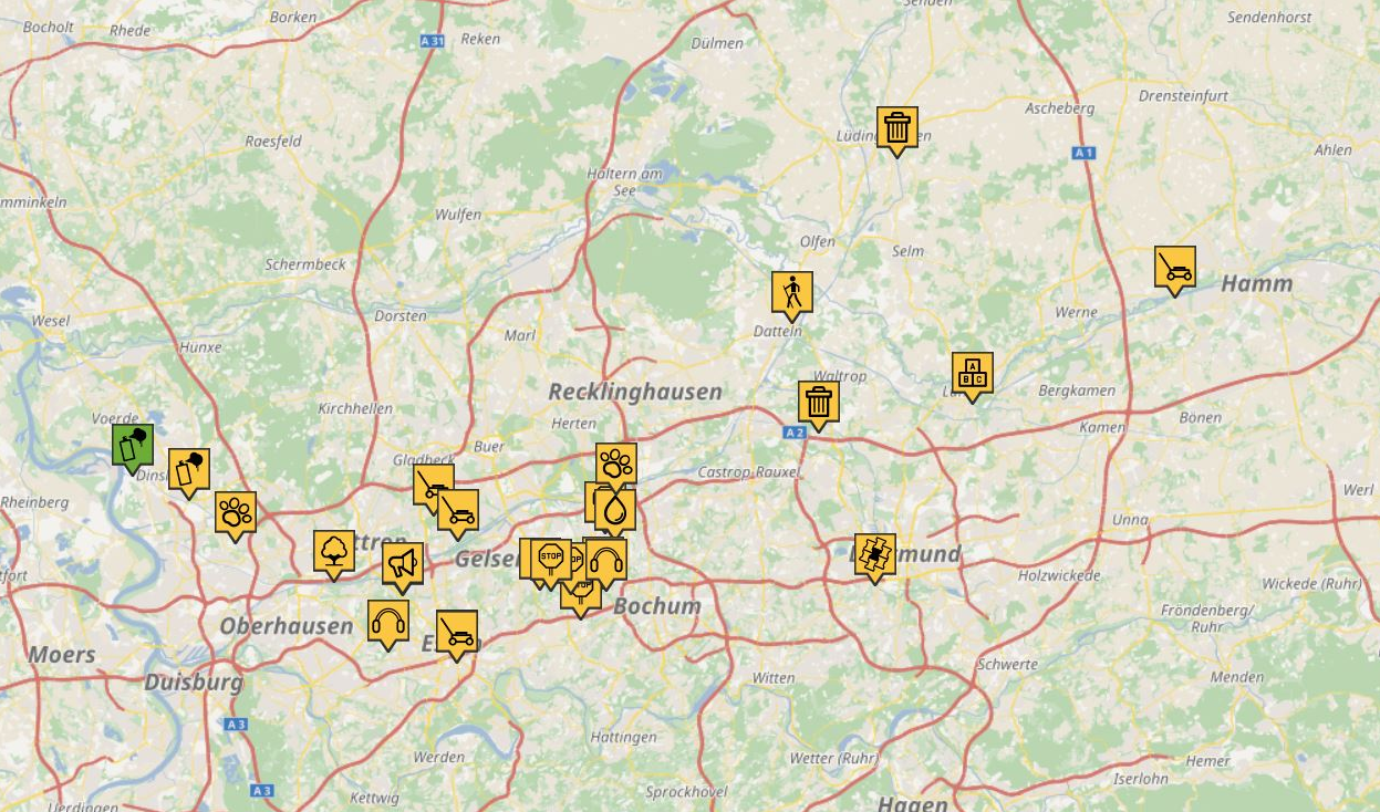 Über die eingebettete Karte im EGLV-Mängelmelder können Bürgerinnen und Bürger direkt sehen, in welchen Gebieten bereits Hinweise bei Emschergenossenschaft und Lippeverband eingegangen sind. Die unterschiedlichen Symbole stehen dabei für die verschiedenen Beschwerdekategorien, die im System hinterlegt sind. Neue Meldungen erhalten zunächst einen gelben Marker – wenn die Bearbeitung beendet ist, wechselt die Farbe zu grün. Mit einem Klick auf das Symbol erhalten die Nutzenden weitere Informationen zum jeweiligen Sachverhalt.