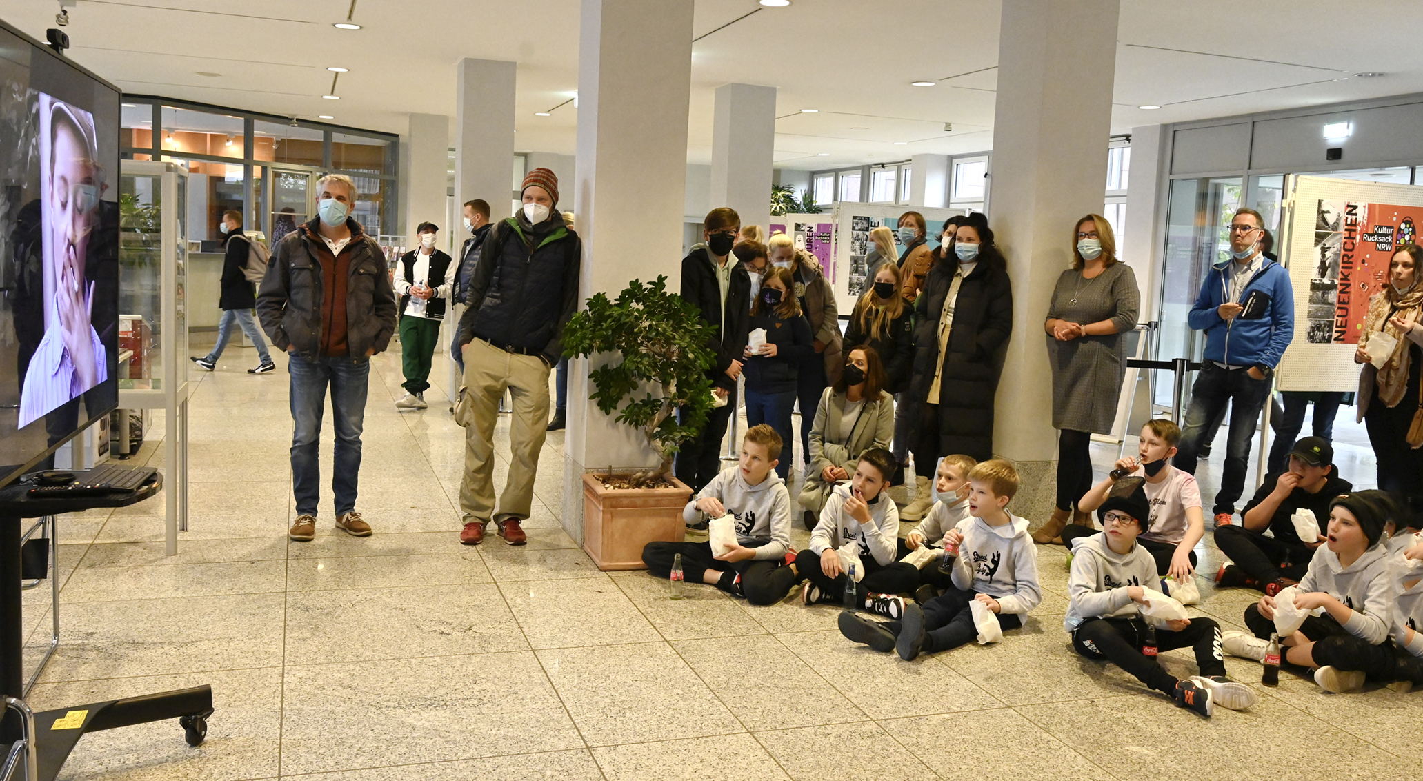 Bei der Ausstellungseröffnung sorgten Ausschnitte aus dem Film „Die schwarze Hand“ (Filmwerkstatt Altenberge) für Spannung, Popcorn und Getränke für Kinoatmosphäre.