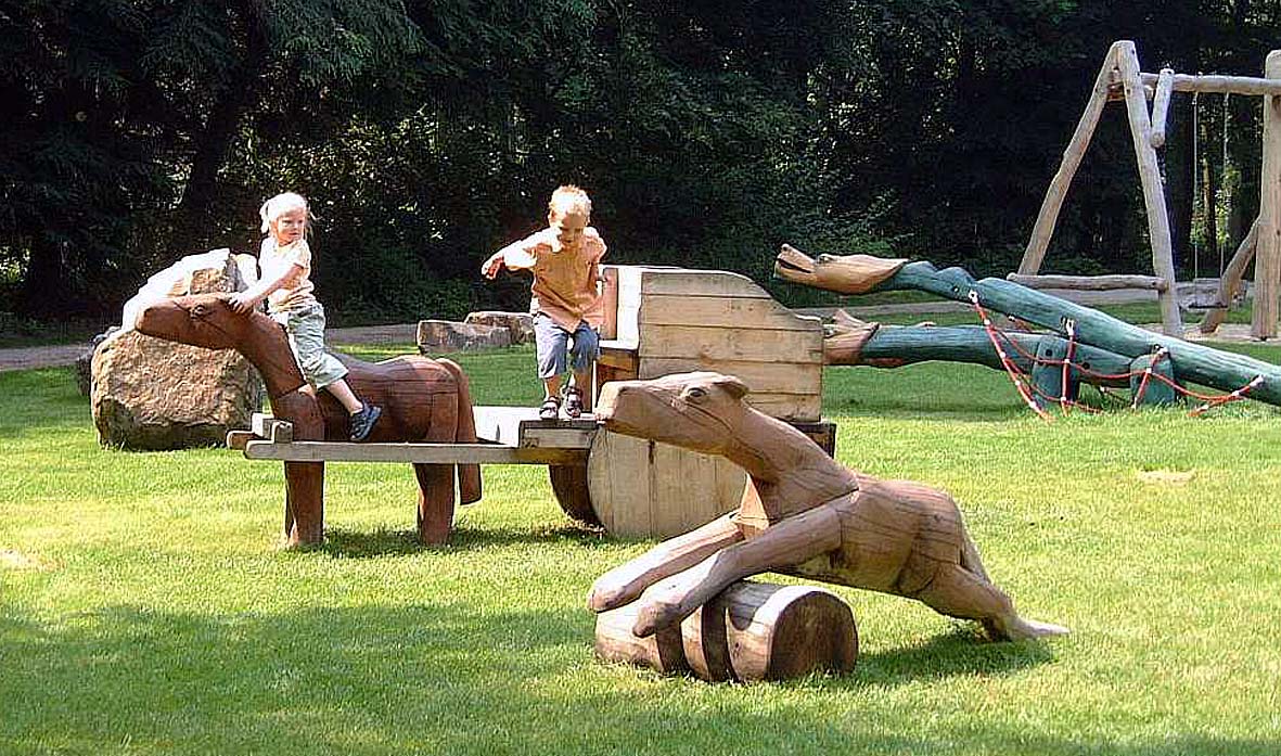 Die Holztiere, die im Rahmen der Beschäftigungsförderungsmaßnahmen im Katzenbusch eingezogen sind, laden die Kinder zum Spielen ein.