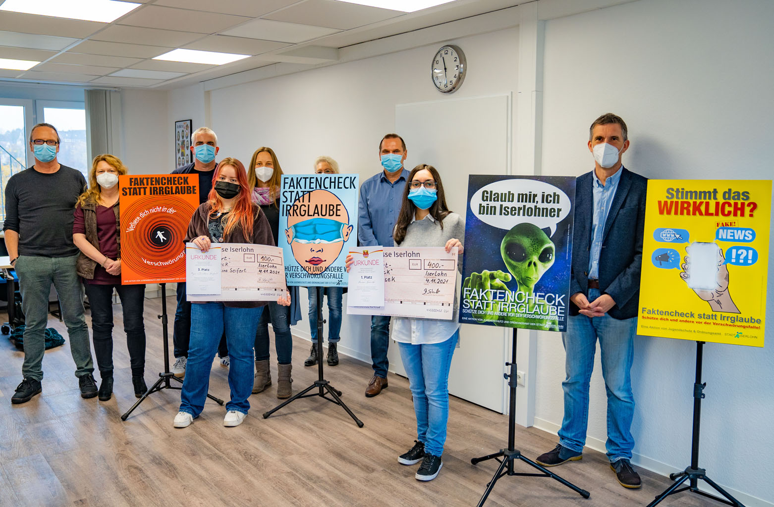 Organisatoren und Teilnehmer der Plakatkampagne stellten die Siegerentwürfe vor. Hintere Reihe v.l.: Bernd Schulte (städtische Jugendarbeit), Ordnungsamtsleiterin Angela Schunke, Holger Albertini und Diana Wilke (Berufskolleg MK), Sabine Habeck (Ordnungsamt), Josef Schulte (Schulleiter Berufskolleg) und der städtische Beigeordnete Martin Stolte. Zwei der symbolischen Schecks über die Siegerprämien gingen an die Schülerinnen Maya Christine Seifert (l.) und Yaren Simsek.