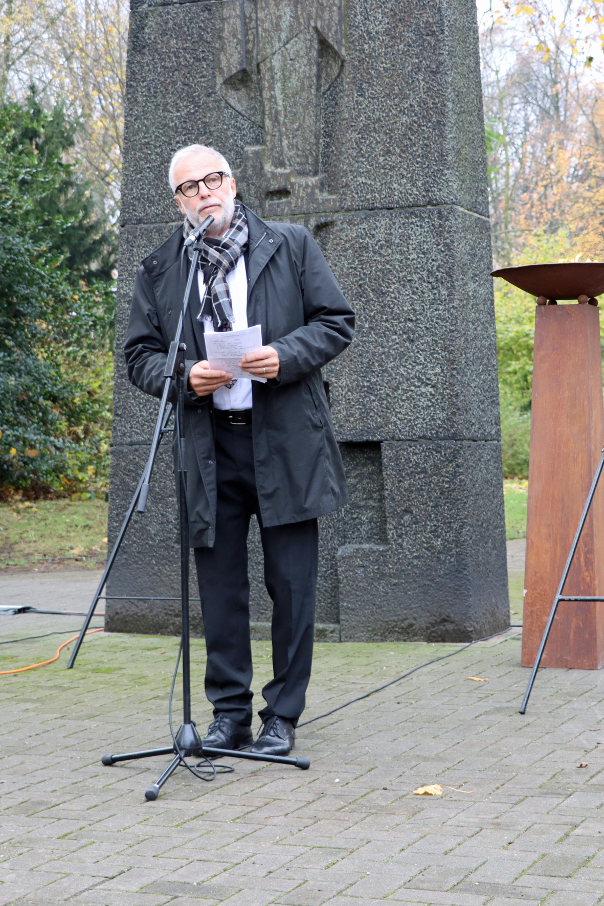 Bürgermeister Matthias Müller erinnert in seiner Rede an die Opfer vergangener Kriege und betont die Bedeutung des Gedenktages.