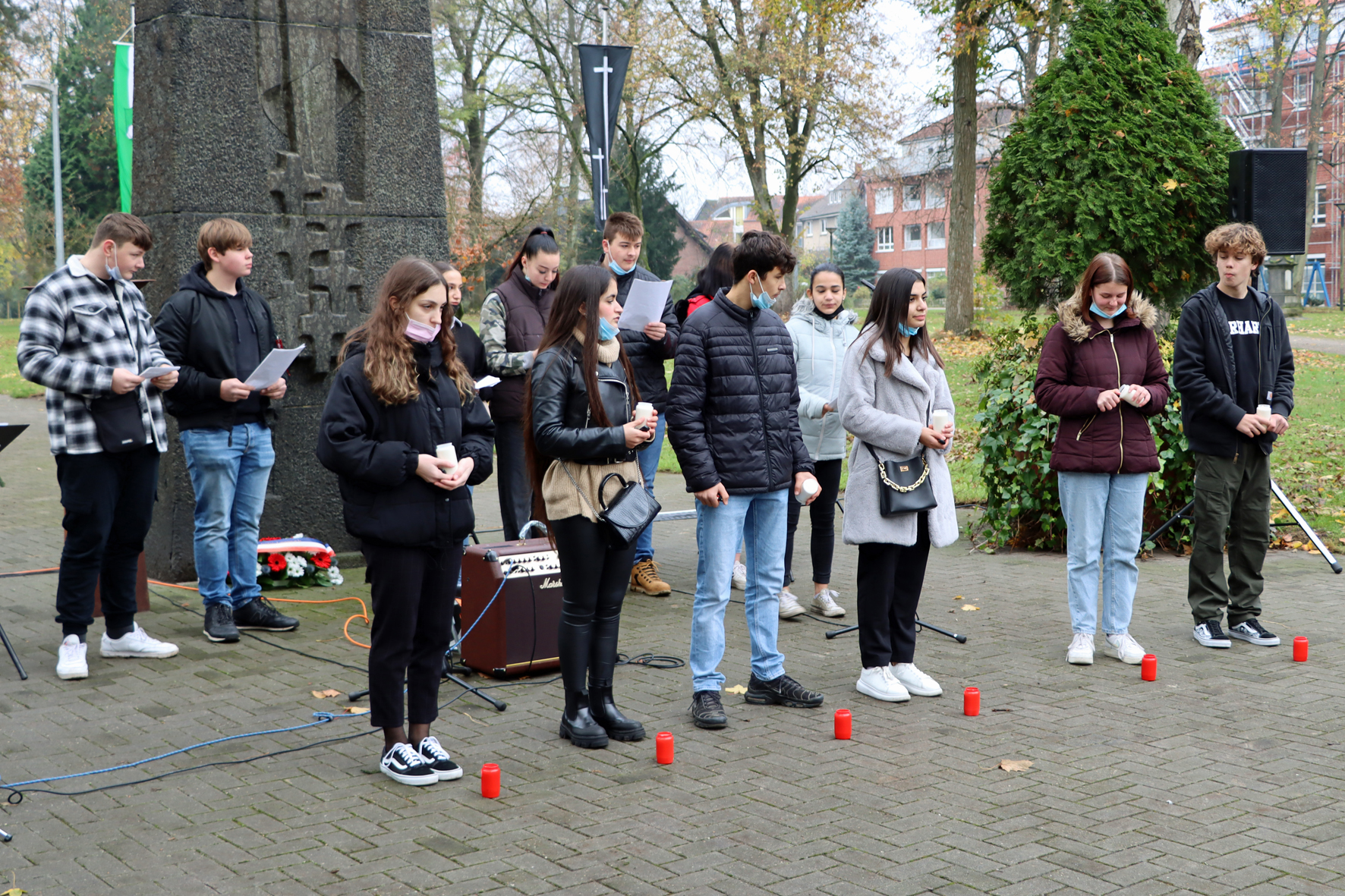 Nach der Kranzniederlegung trugen Schülerinnen und Schüler der Martin-Luther-Schule ihre Gedanken zum Volkstrauertag vor.