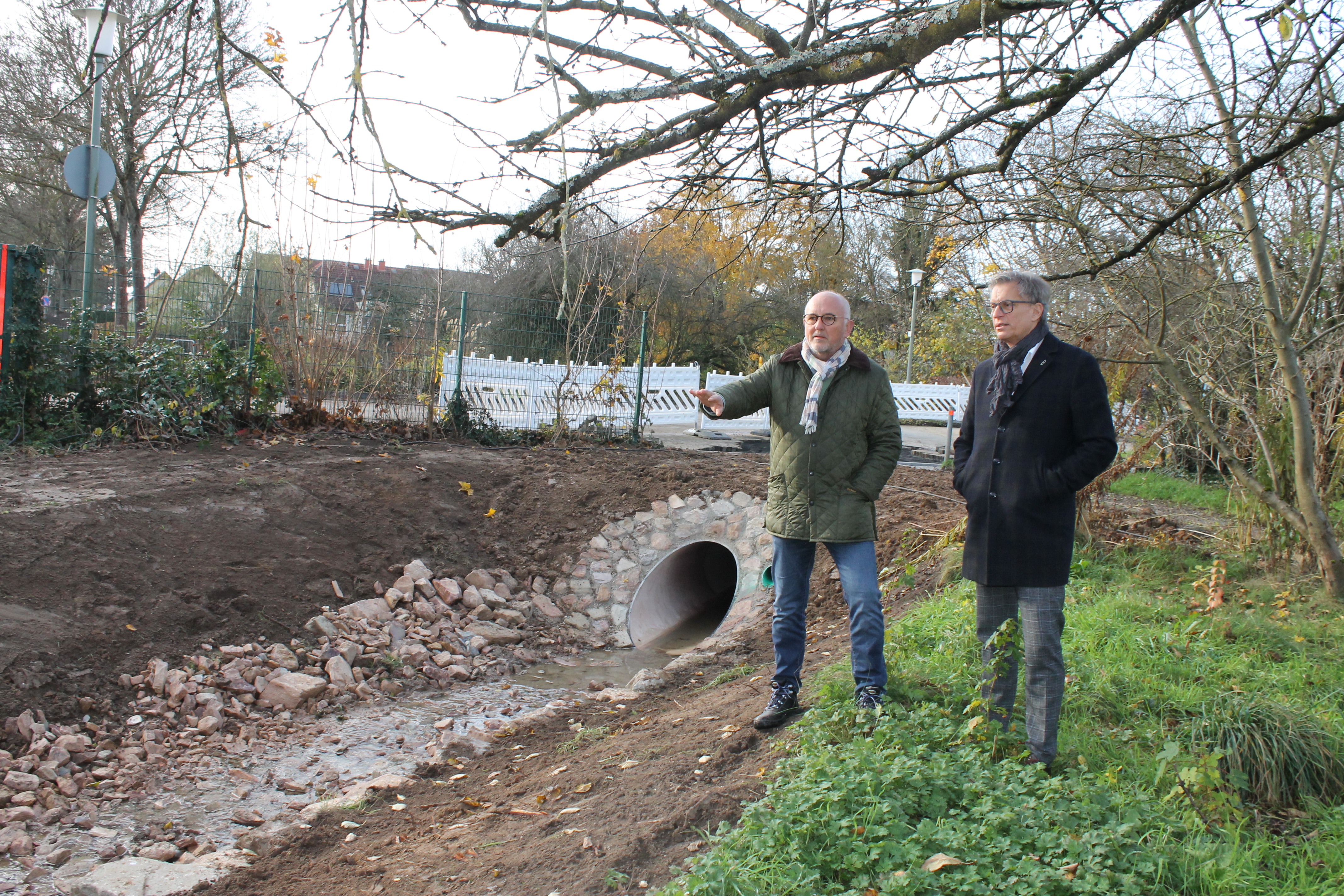 Wo am Wendehammer Zur Breulwiese die innerörtliche Entwässerung in den neuen Graben mündet: Stadtrat Thomas Morlock (rechts) lässt sich von HIS-Abteilungsleiter Ruess die Zusammenhänge erläutern.